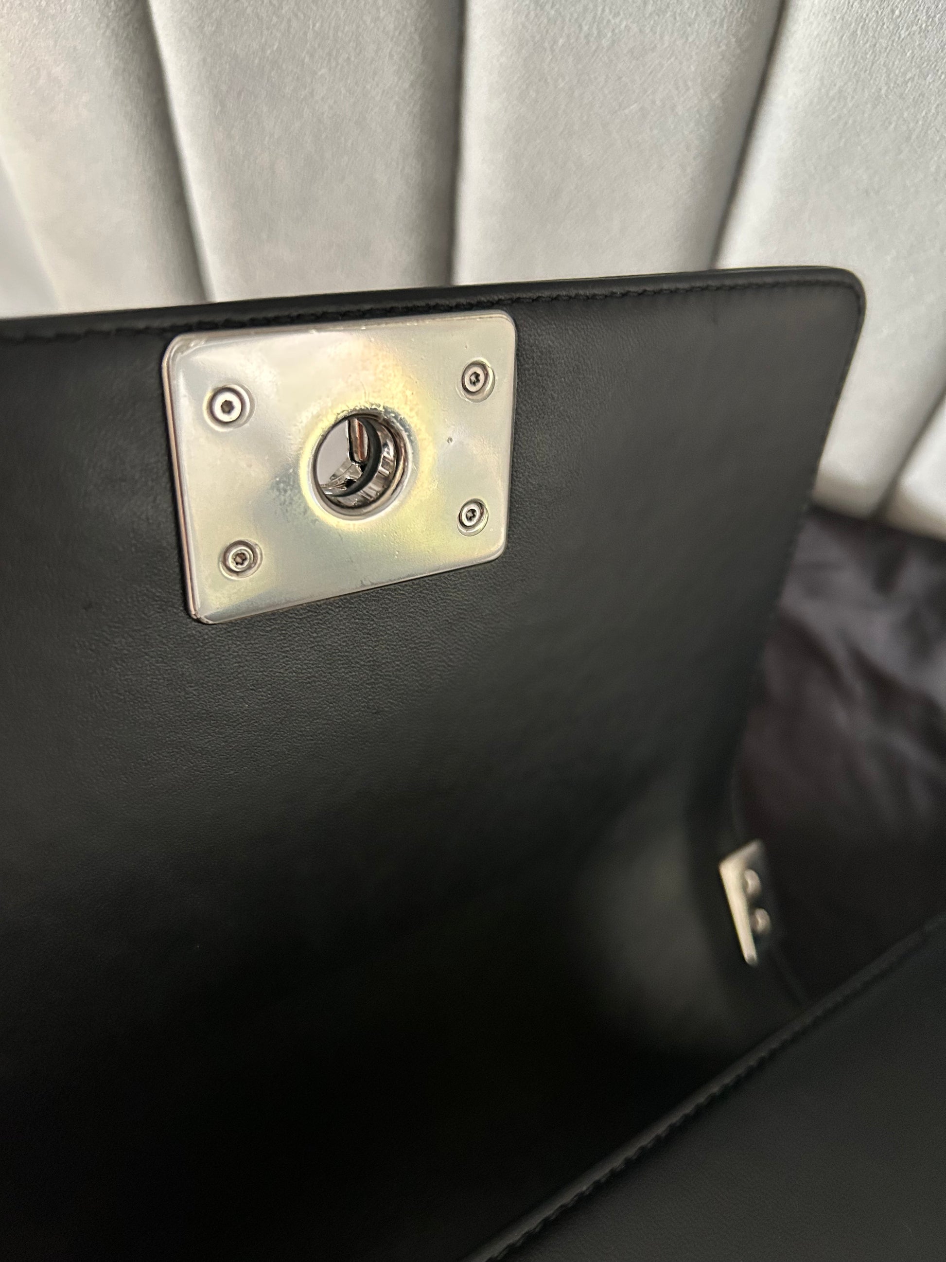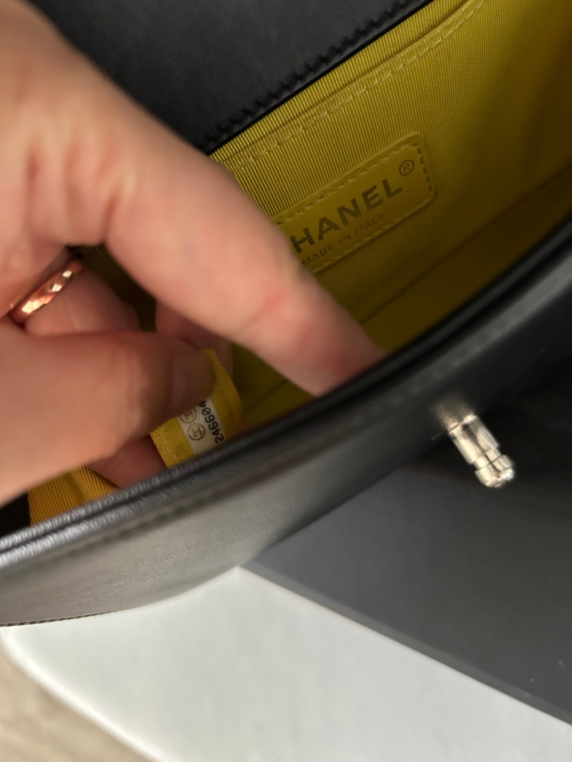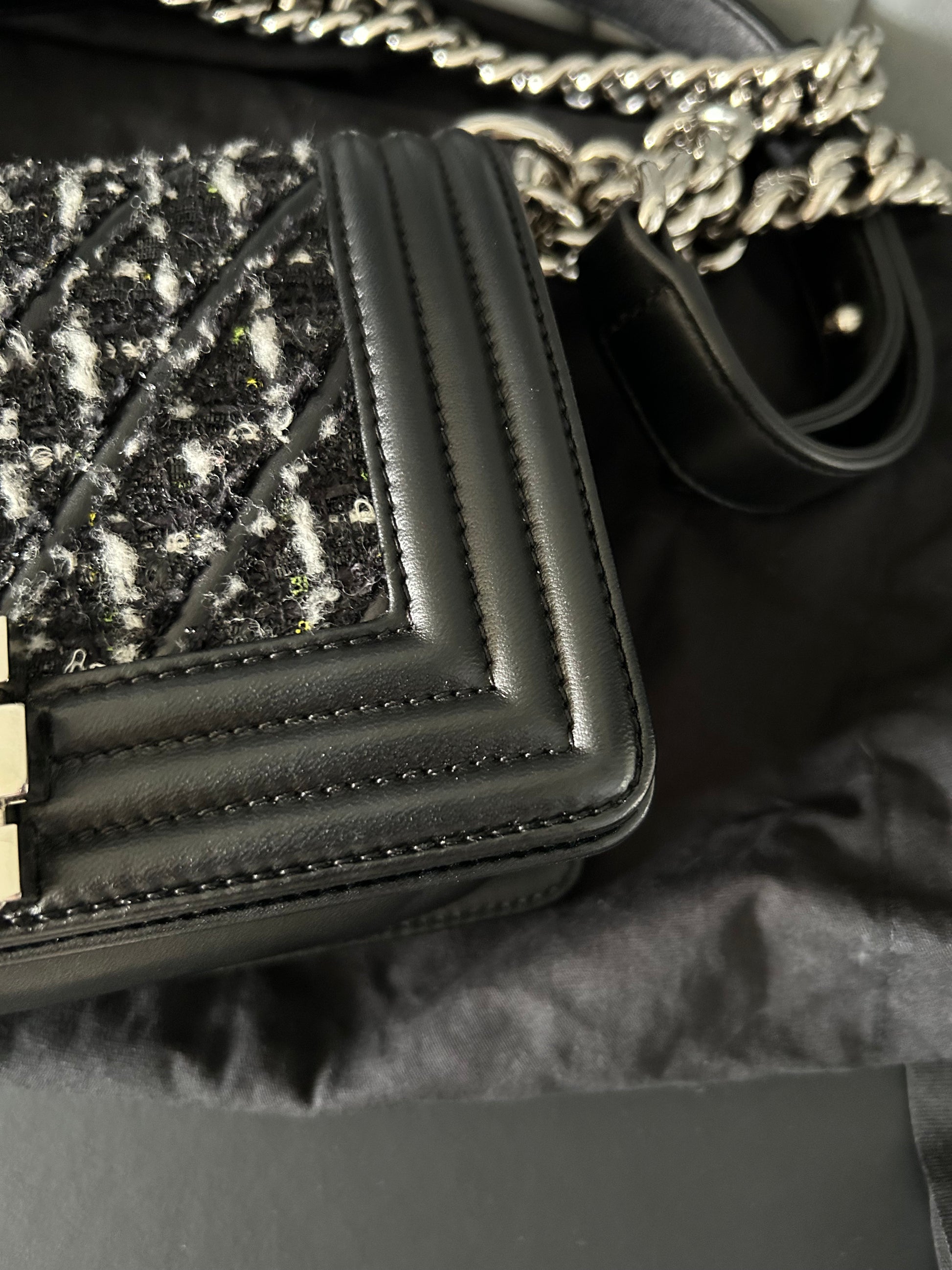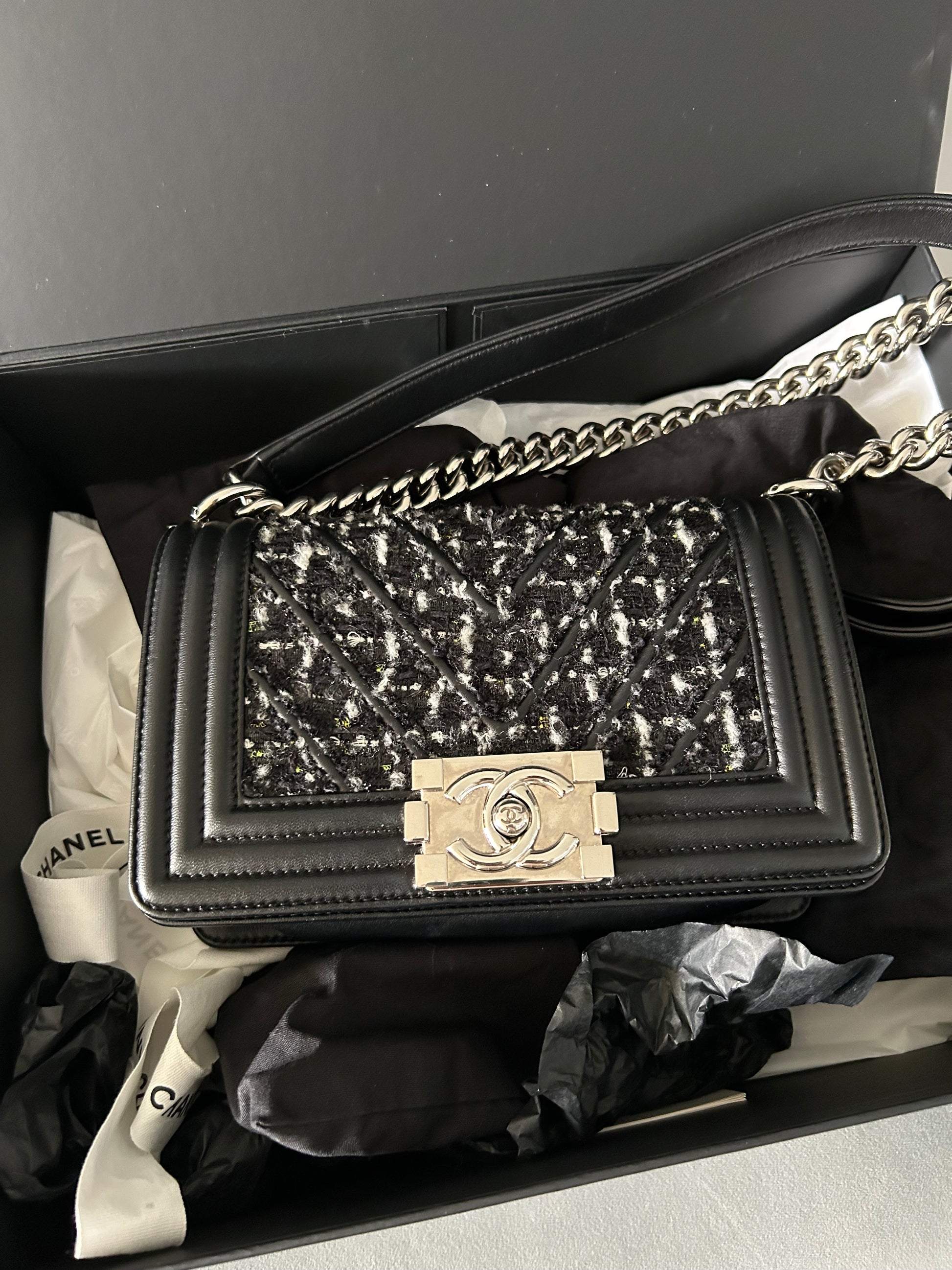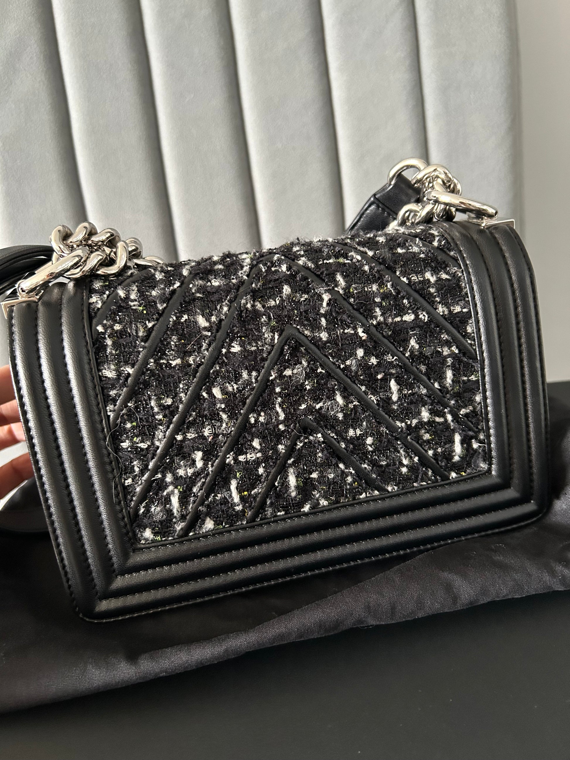 This preloved Chanel Black Quilted Leather and Tweed Small Boy Flap Bag is in excellent condition and includes original authenticity card, dust bag, and box. With dimensions of W20xH12xD8, it is both stylish and practical. Add elegance to any outfit with this must-have bag. Can be used as shoulder bag or crossbody bag.