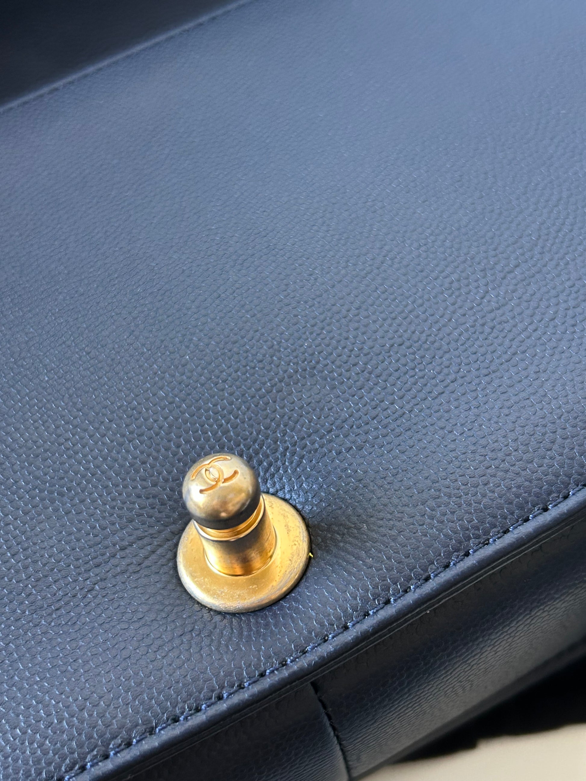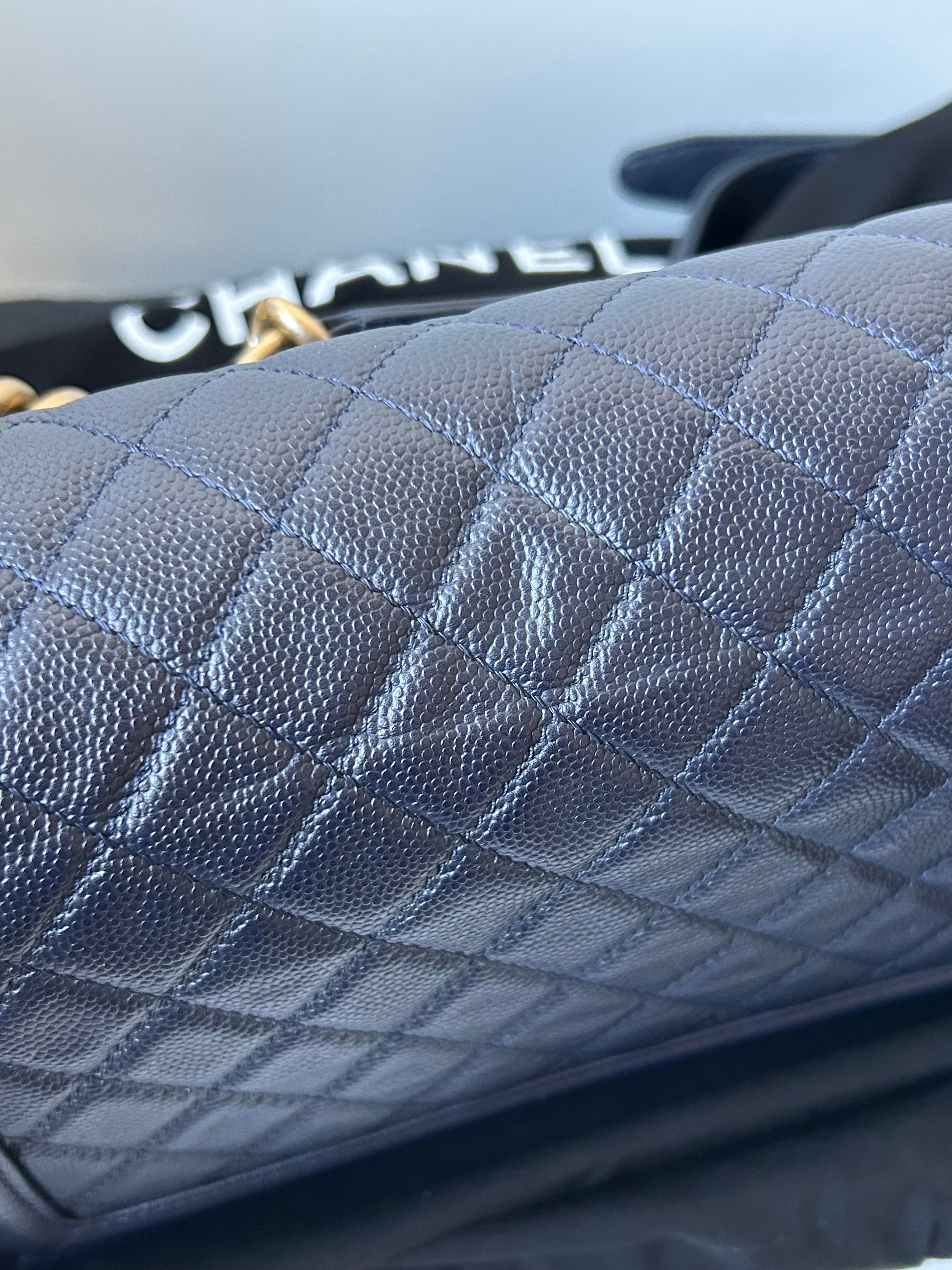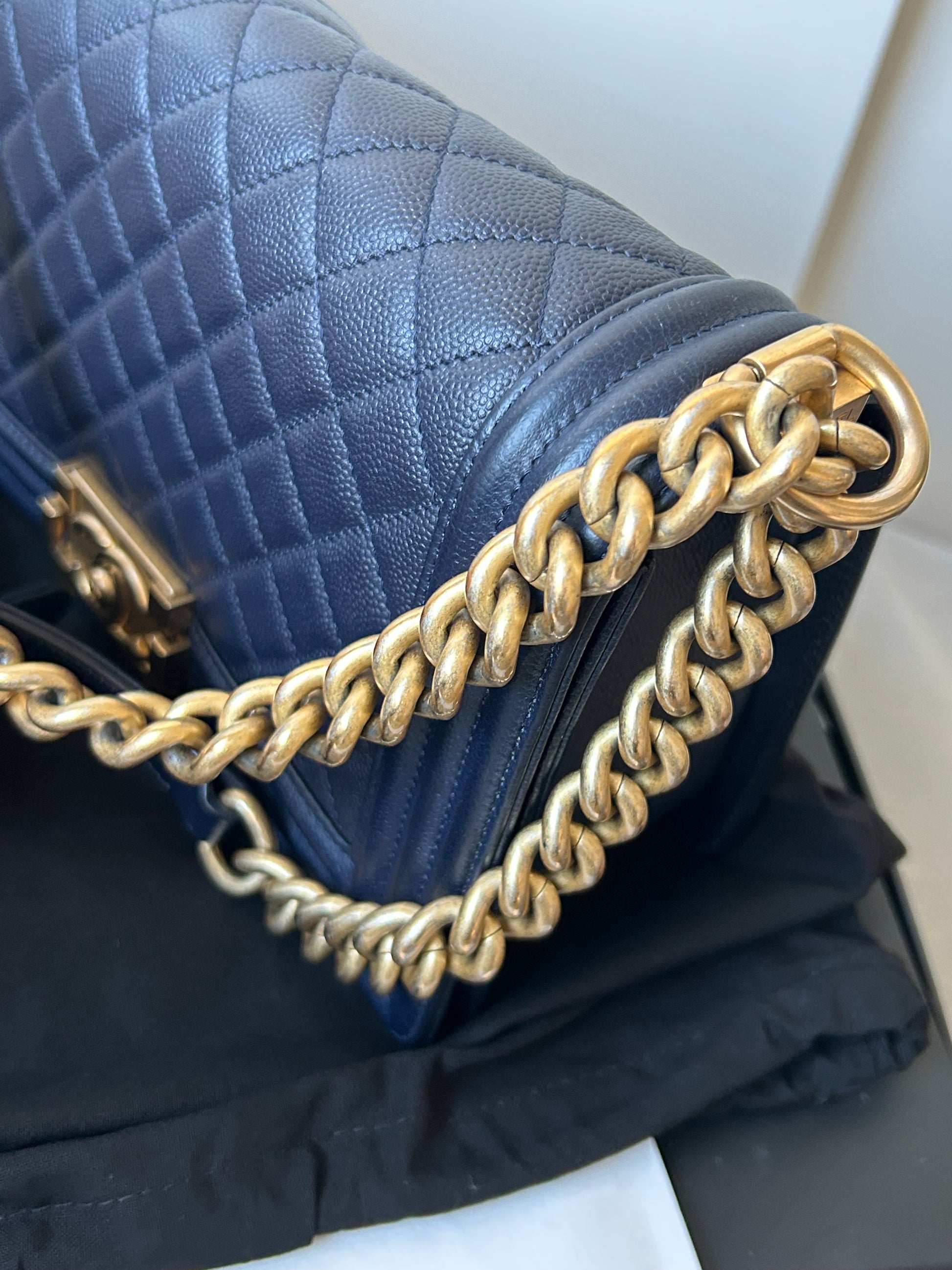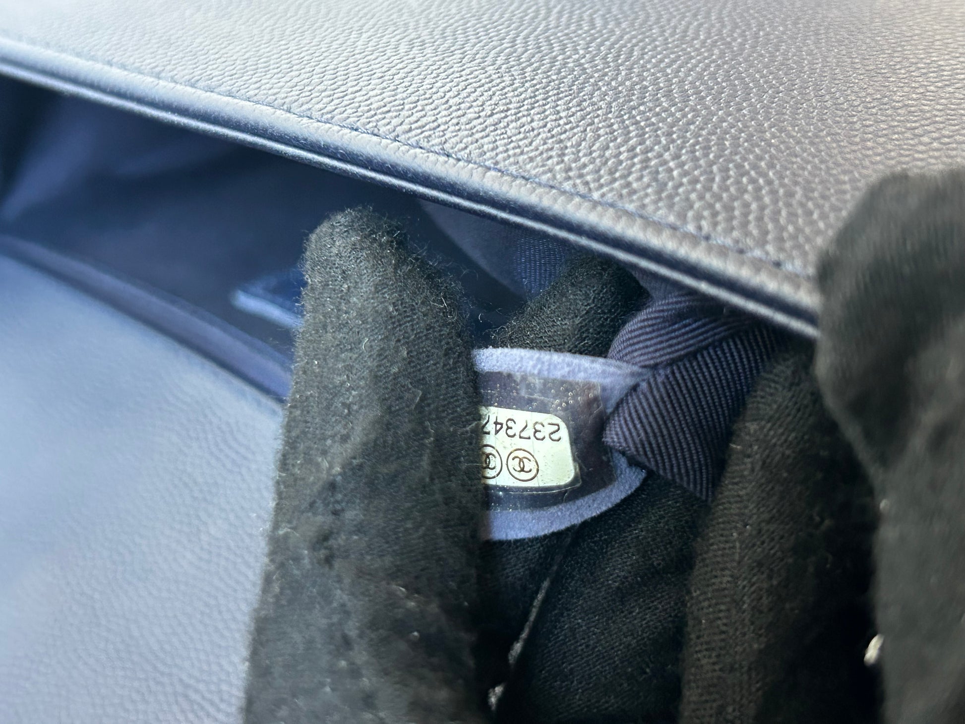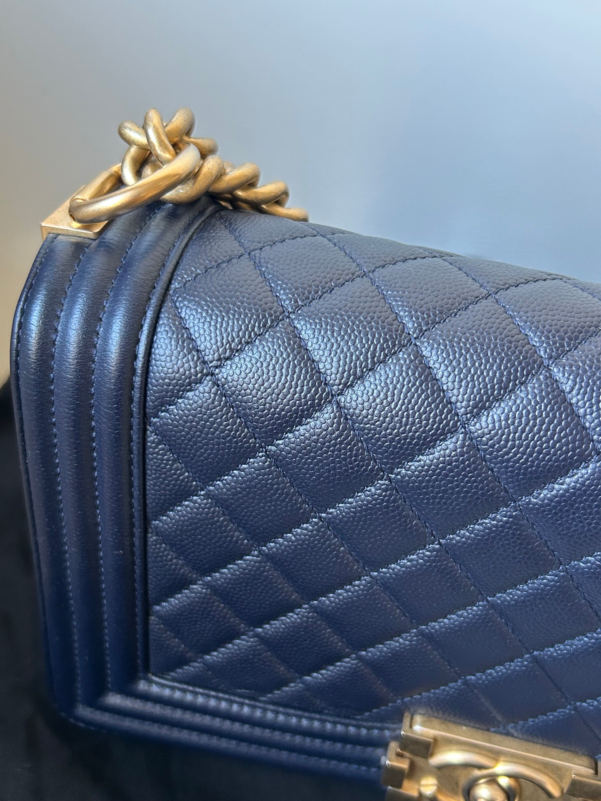The Chanel Le Boy Blue Medium in Caviar Leather is a preloved bag in excellent condition. Crafted with the finest caviar leather, it exudes timeless elegance. With its sturdy and chic design, it seamlessly combines style and functionality. A must-have for any fashion forward individual.