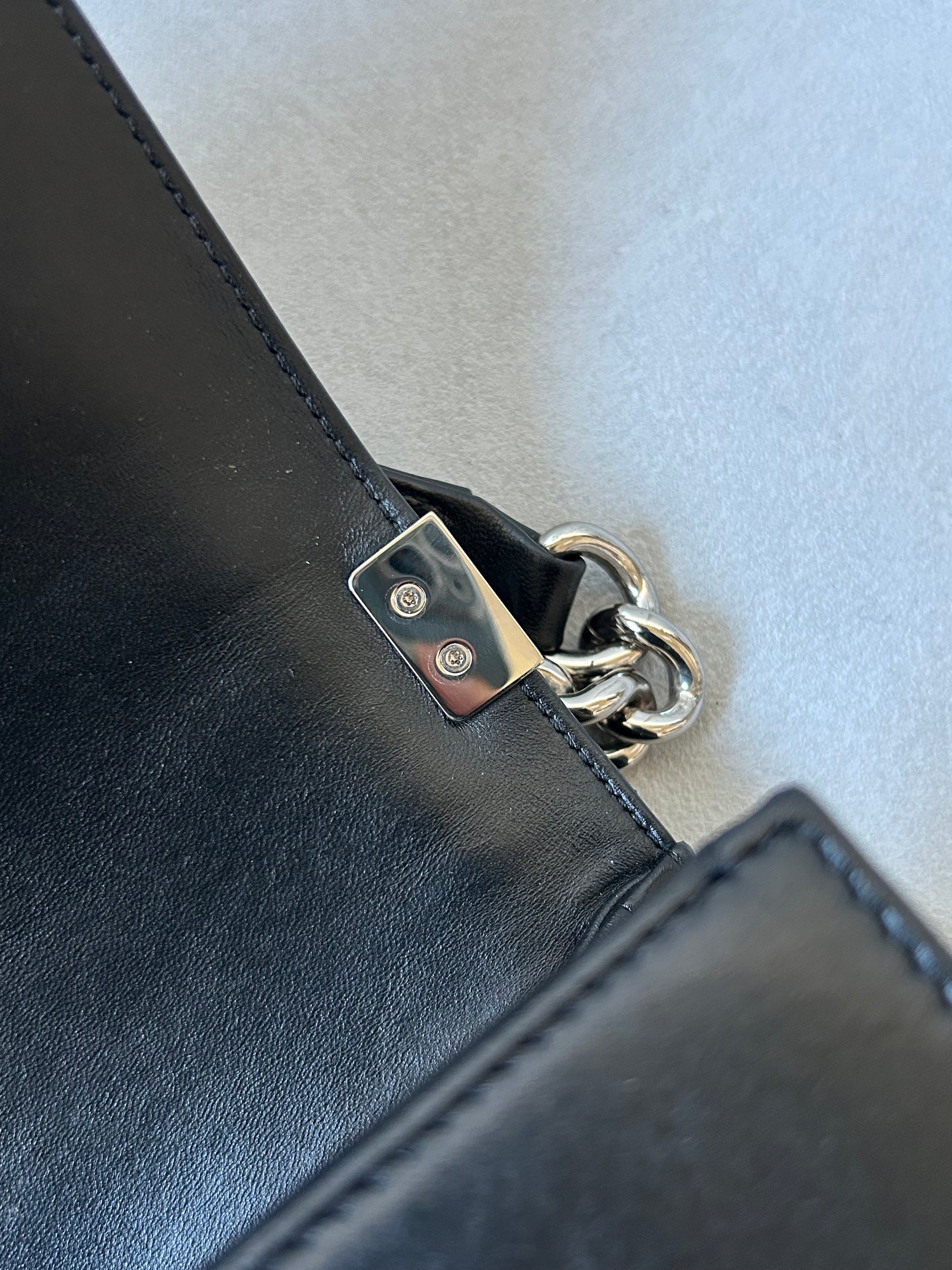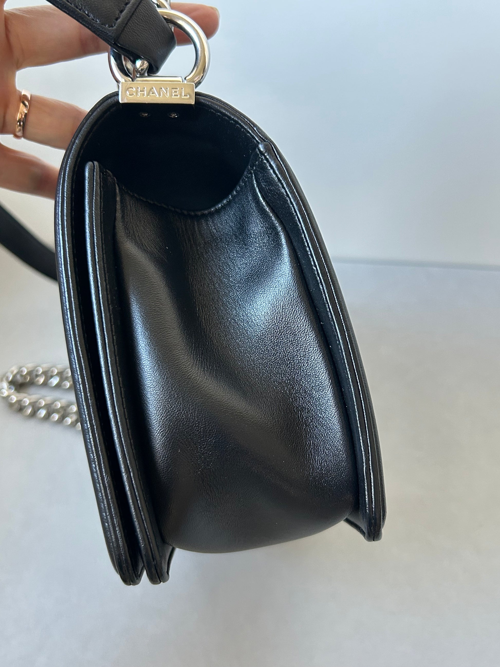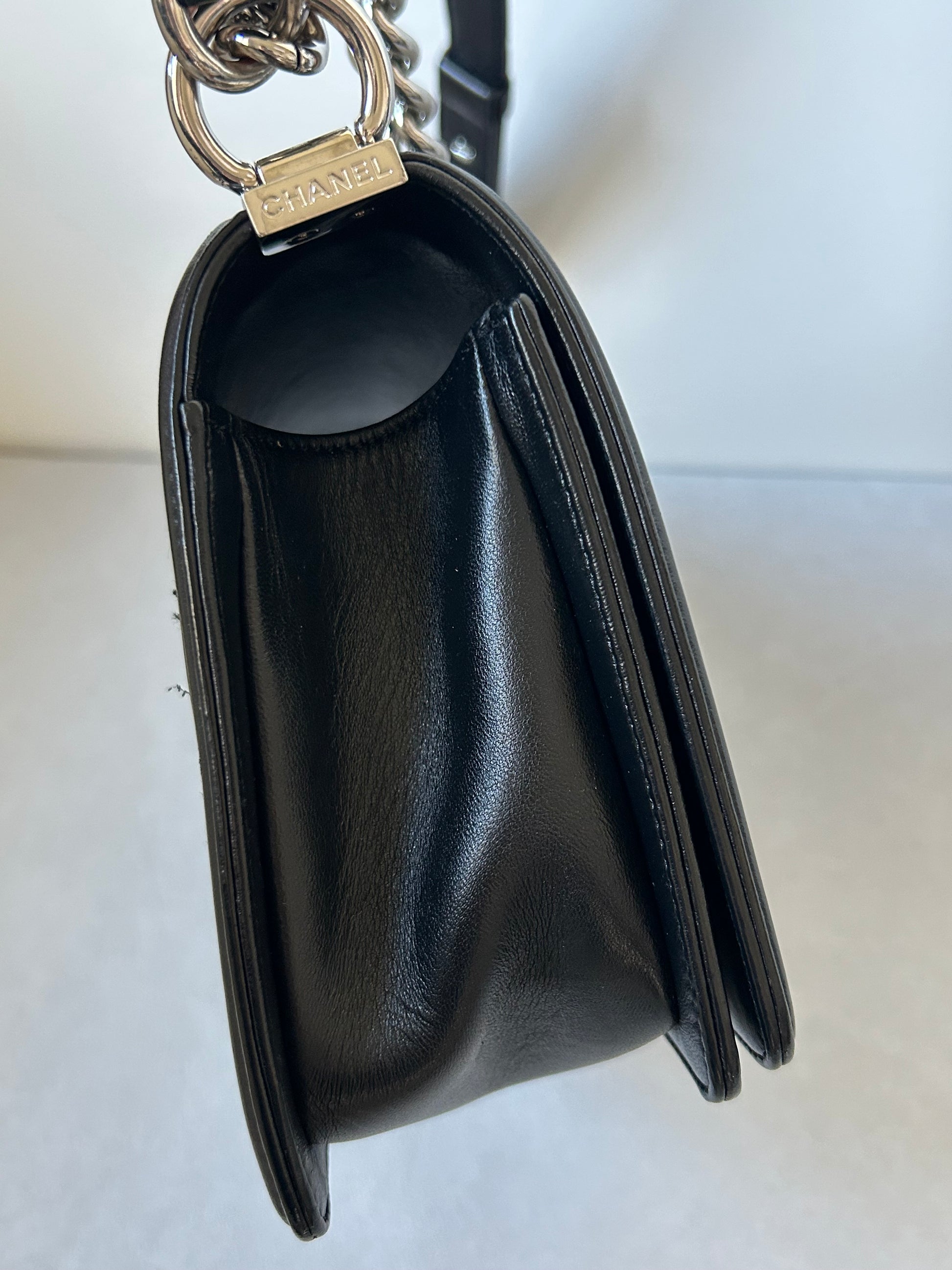This Chanel le boy boasts a timeless combination of black leather and tweed. With its medium size, it's the perfect balance of practicality and luxury. A preloved piece, it offers a sustainable option for fashion-forward individuals. Experience the iconic and elegant style of Chanel with this beautiful addition to your collection.
