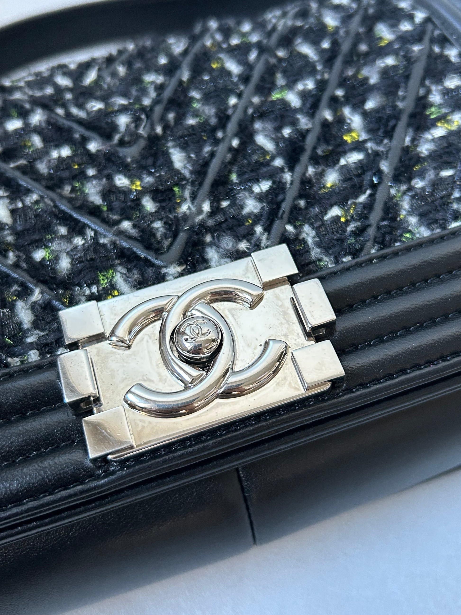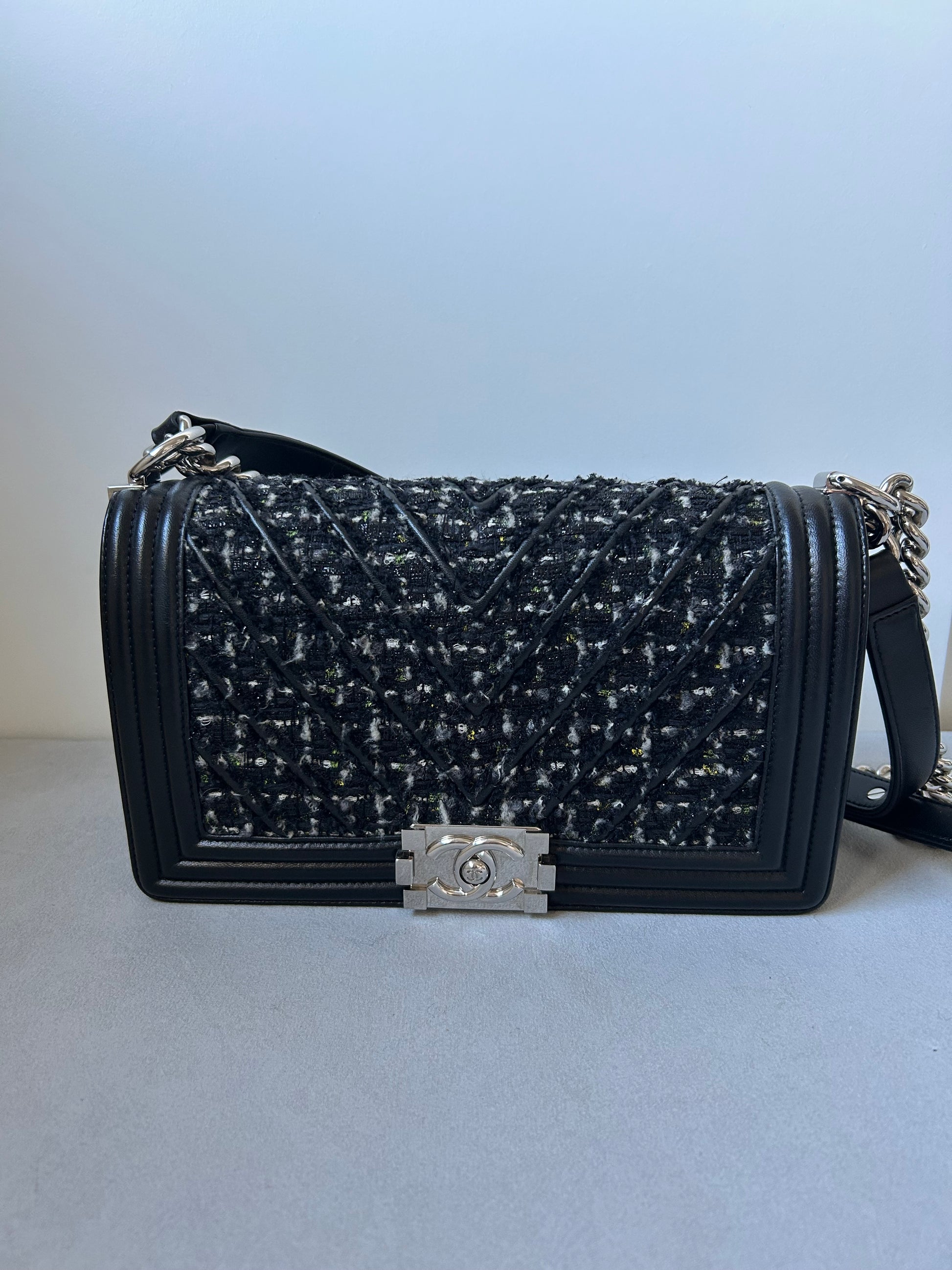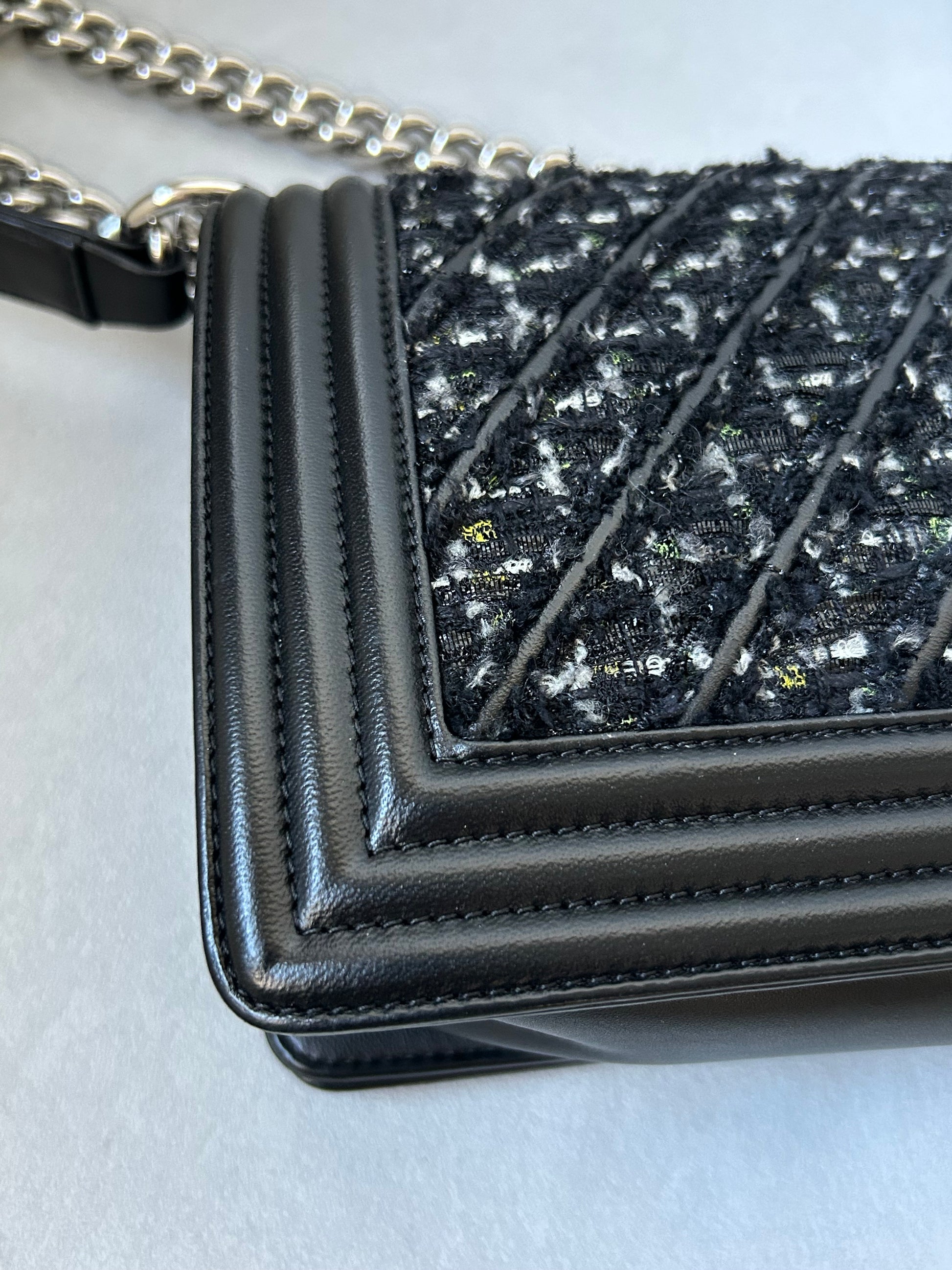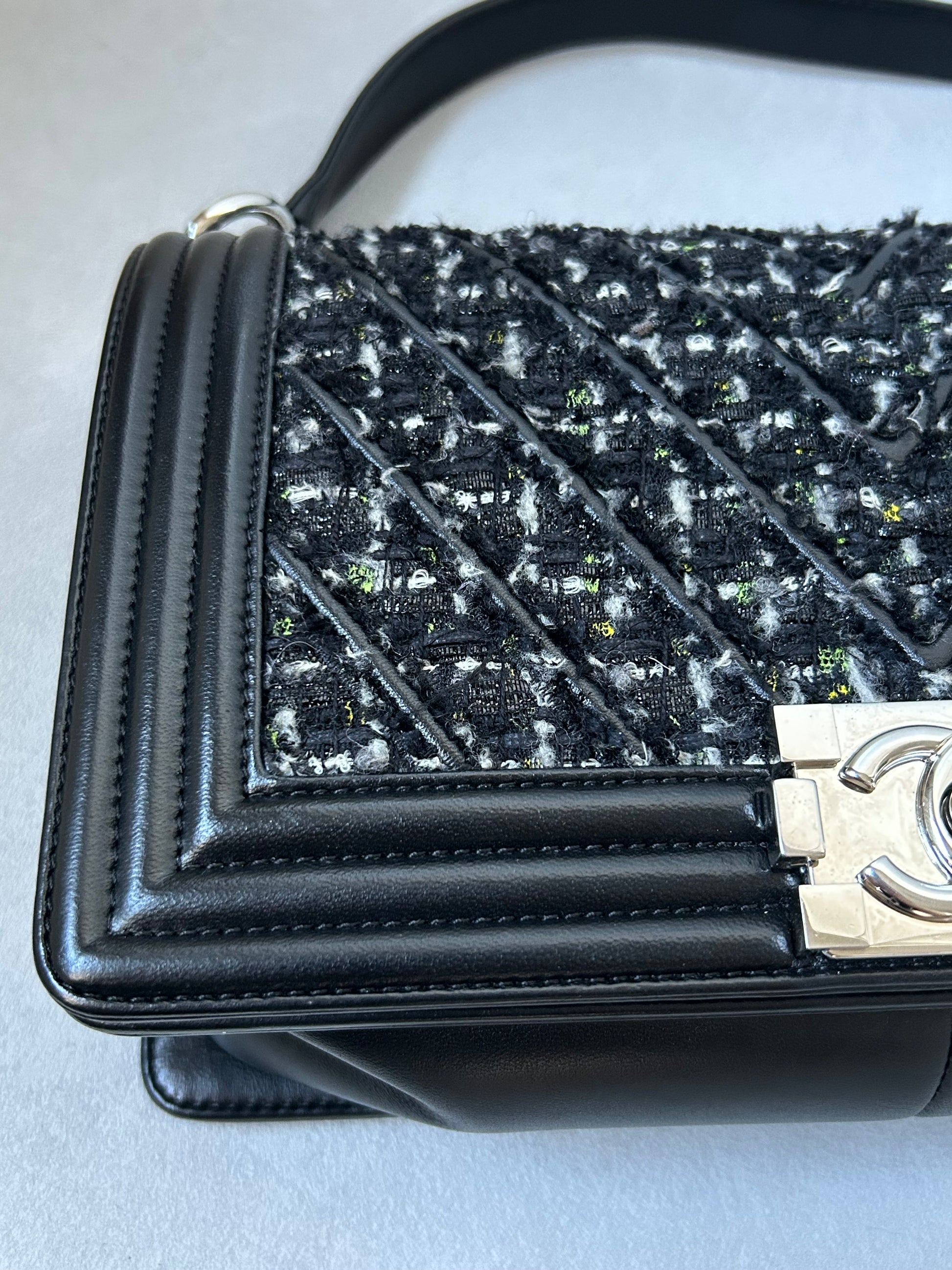 Chanel le boy medium black leather and tweed