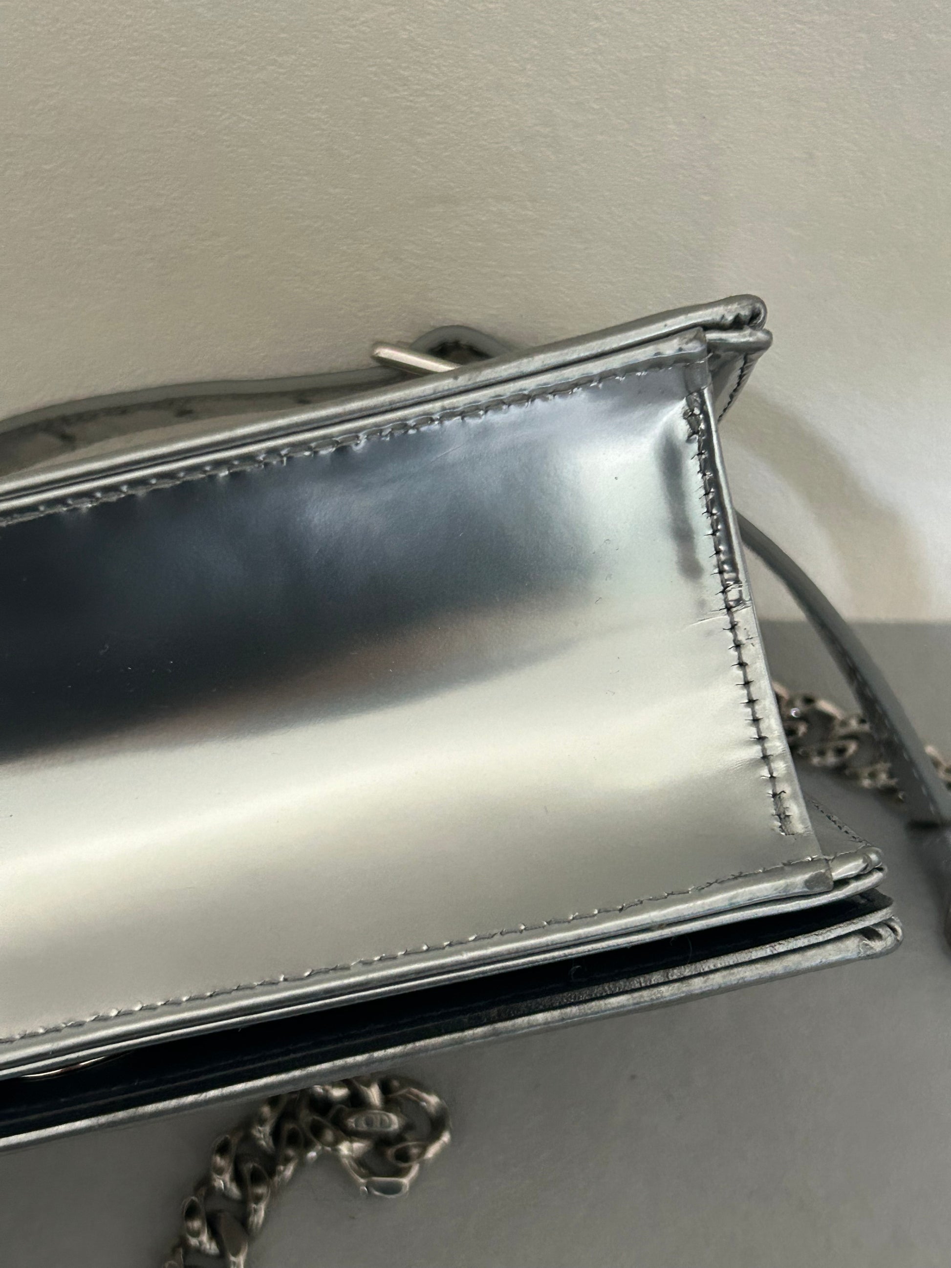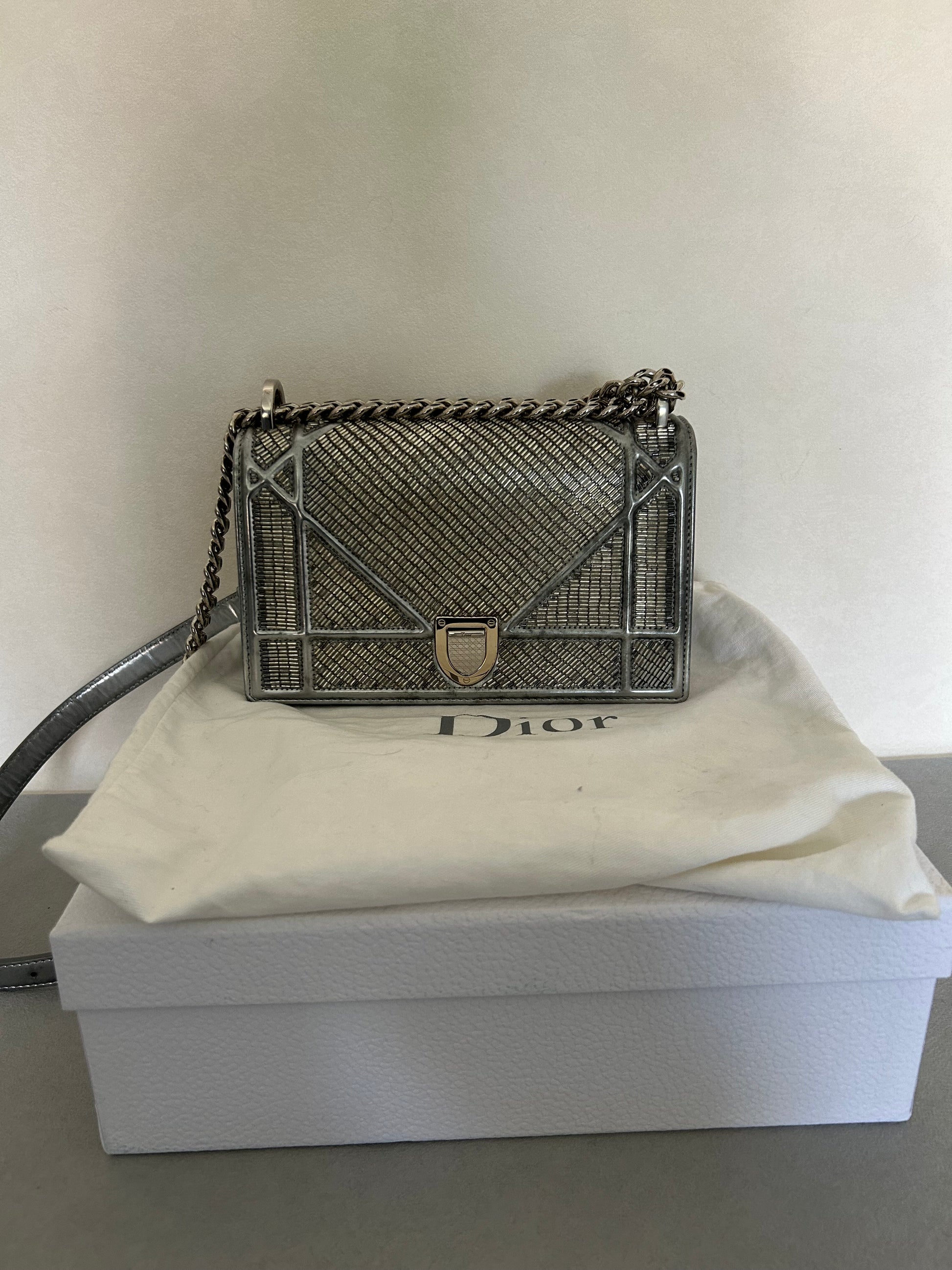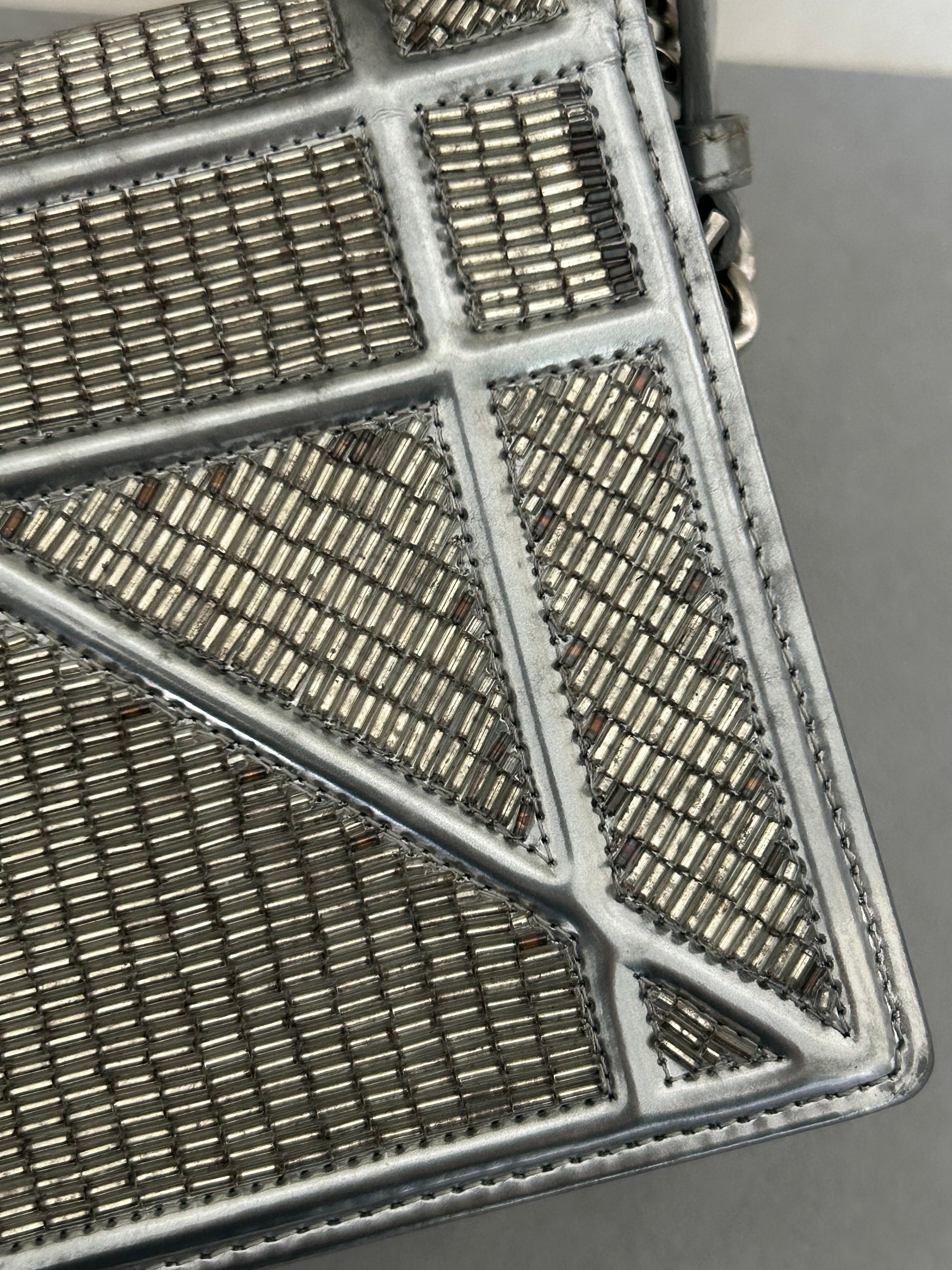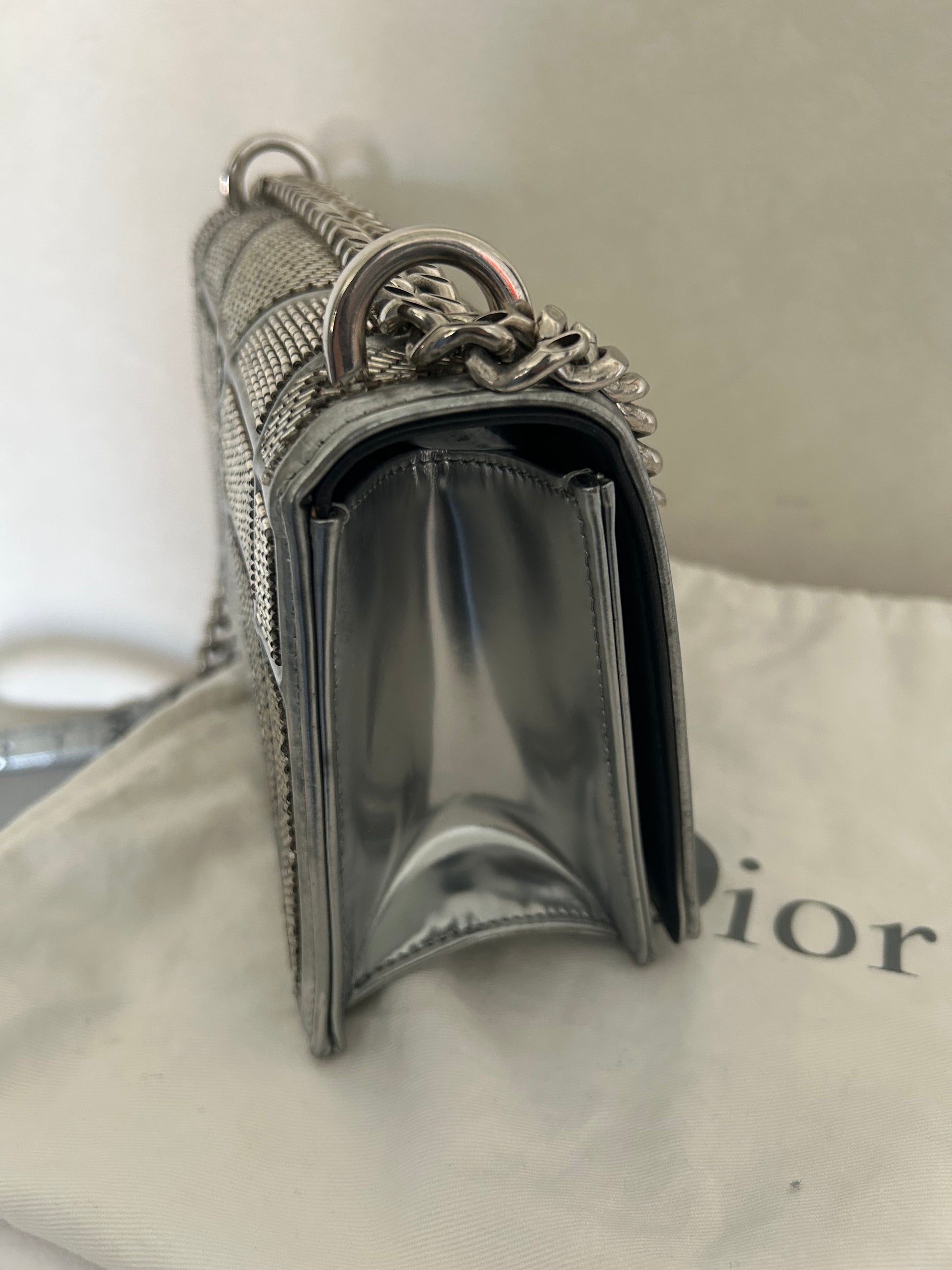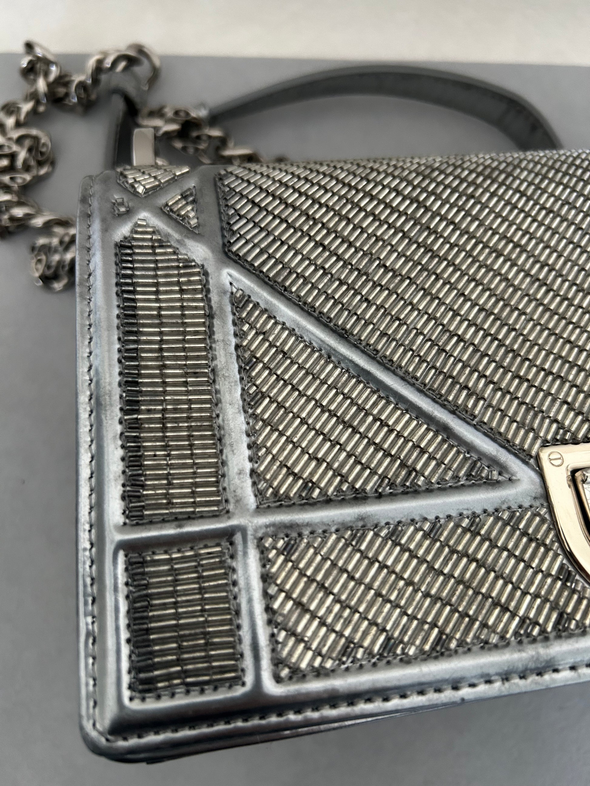 The Dior Diorama metallic beaded flap bag showcases exquisite craftsmanship with its intricate beadwork and sleek metallic finish. Designed for those who appreciate refined luxury, this bag combines elegant aesthetics with practical flap closure, making it an ideal accessory for sophisticated occasions. Adjustable strap can be used as shoulder bag or crossbody bag.