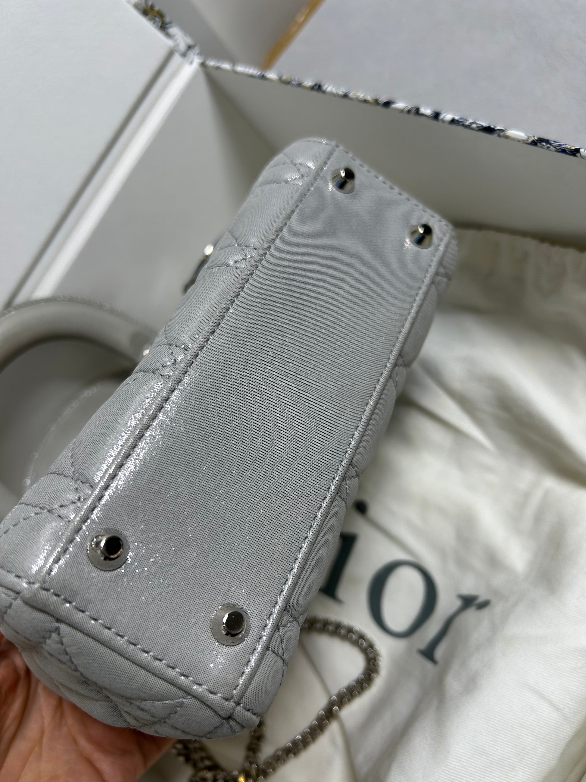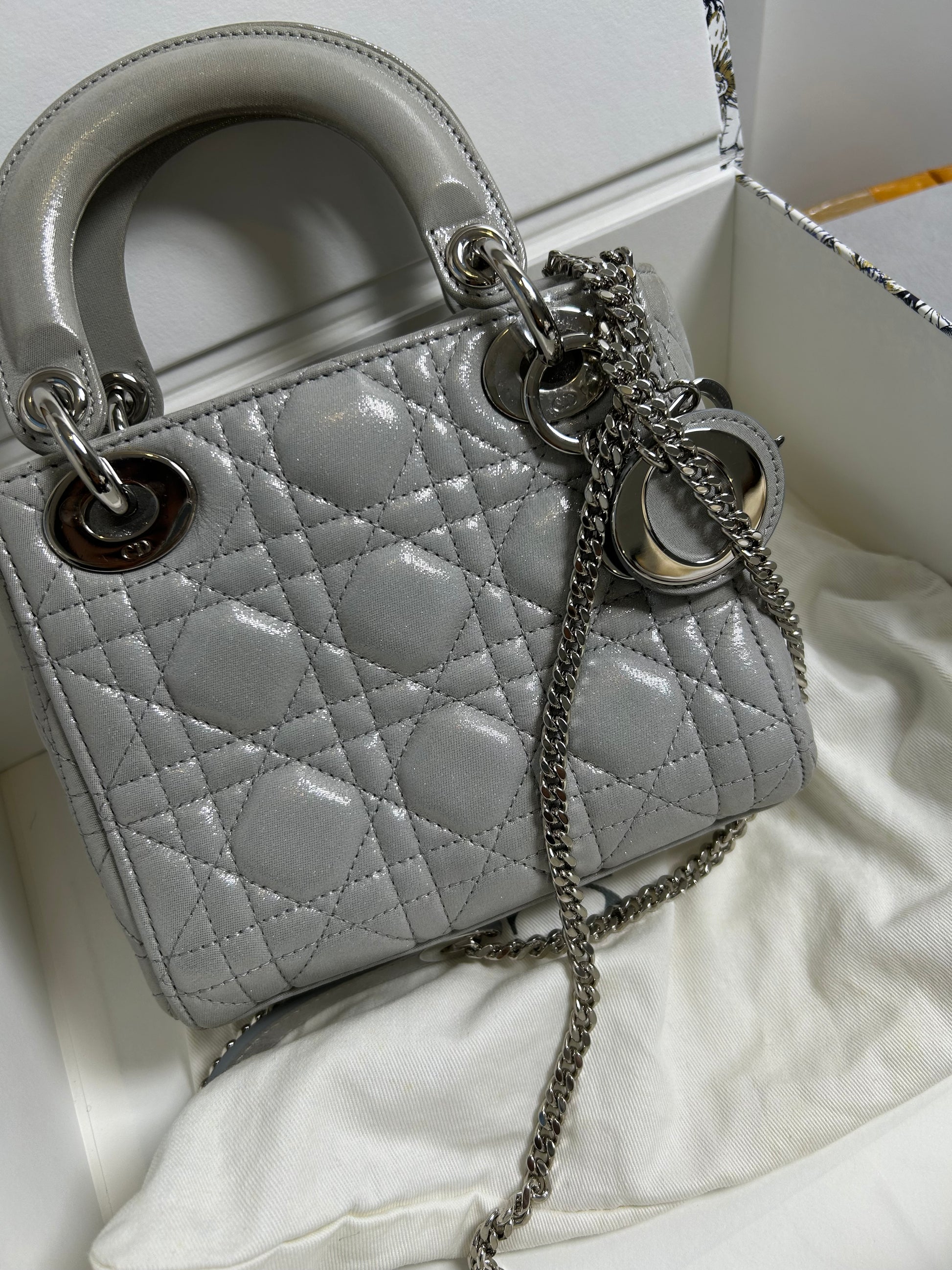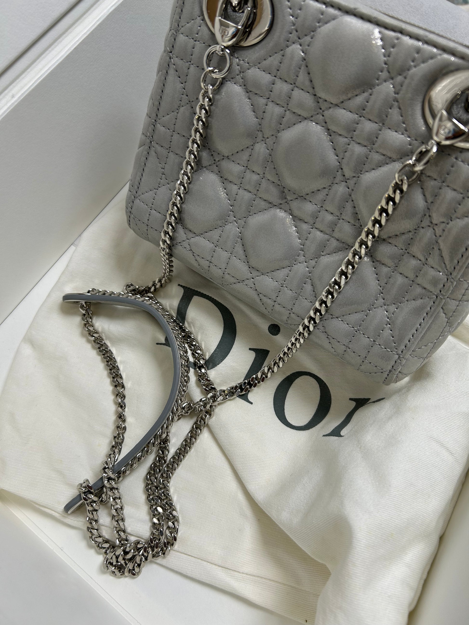 This PRELOVED Dior lady Dior mini pearly grey in excellent condition features a mini size and chain strap. Enjoy the perfect combination of style, convenience, and luxury with this iconic designer handbag.