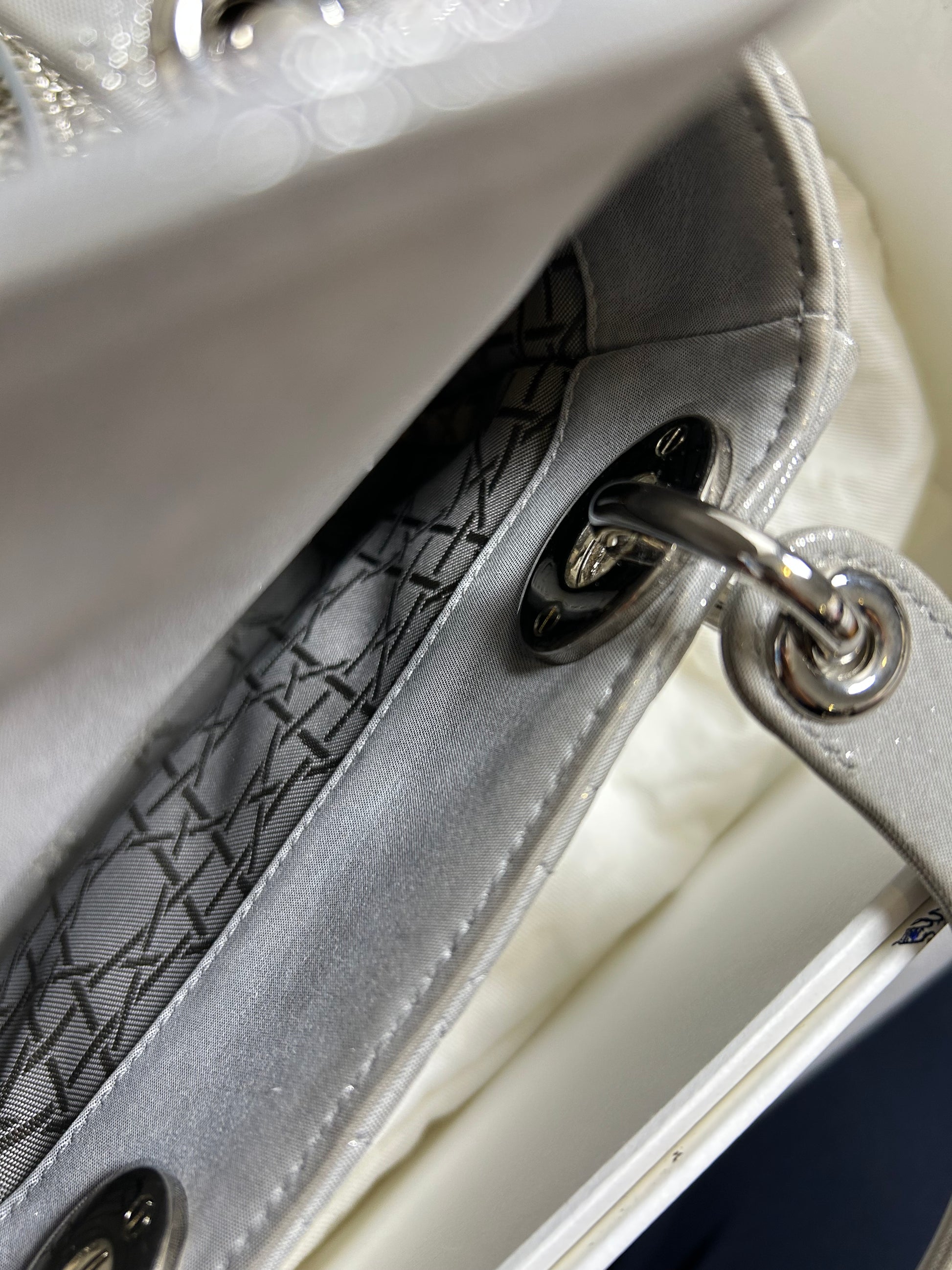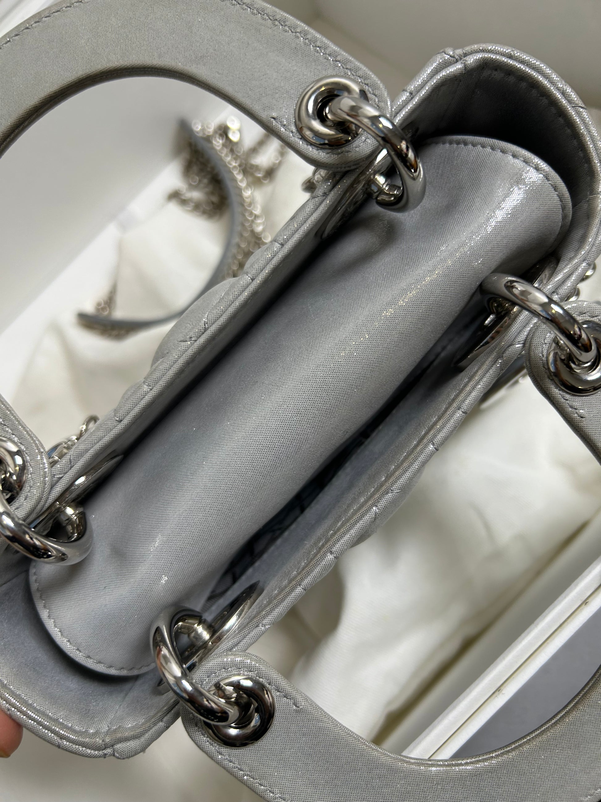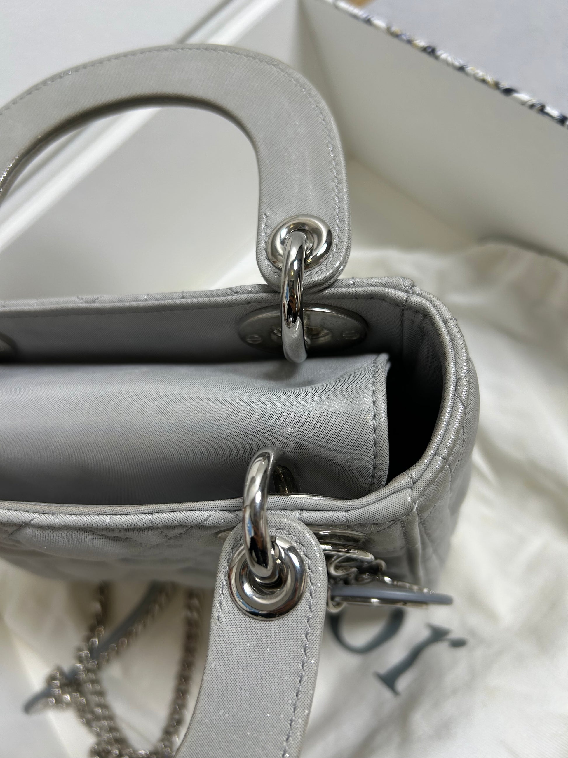 This PRELOVED Dior lady Dior mini pearly grey in excellent condition features a mini size and chain strap. Enjoy the perfect combination of style, convenience, and luxury with this iconic designer handbag.