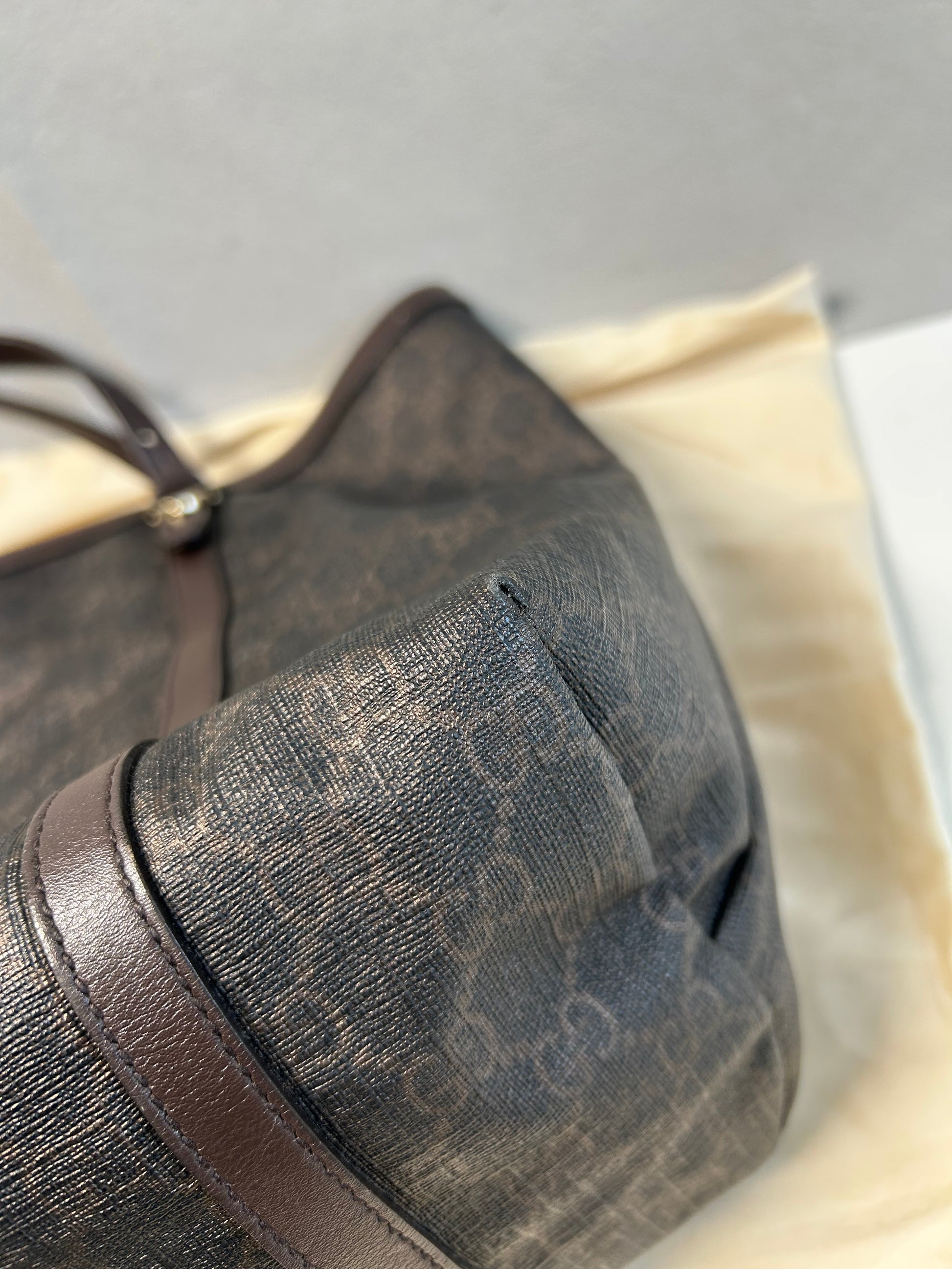 The Gucci dark brown GG supreme Nice tote bag is a stylish and durable option for carrying your essentials. this preloved bag is perfect for any occasion. With its spacious interior and sleek design, it offers both practicality and sophistication.