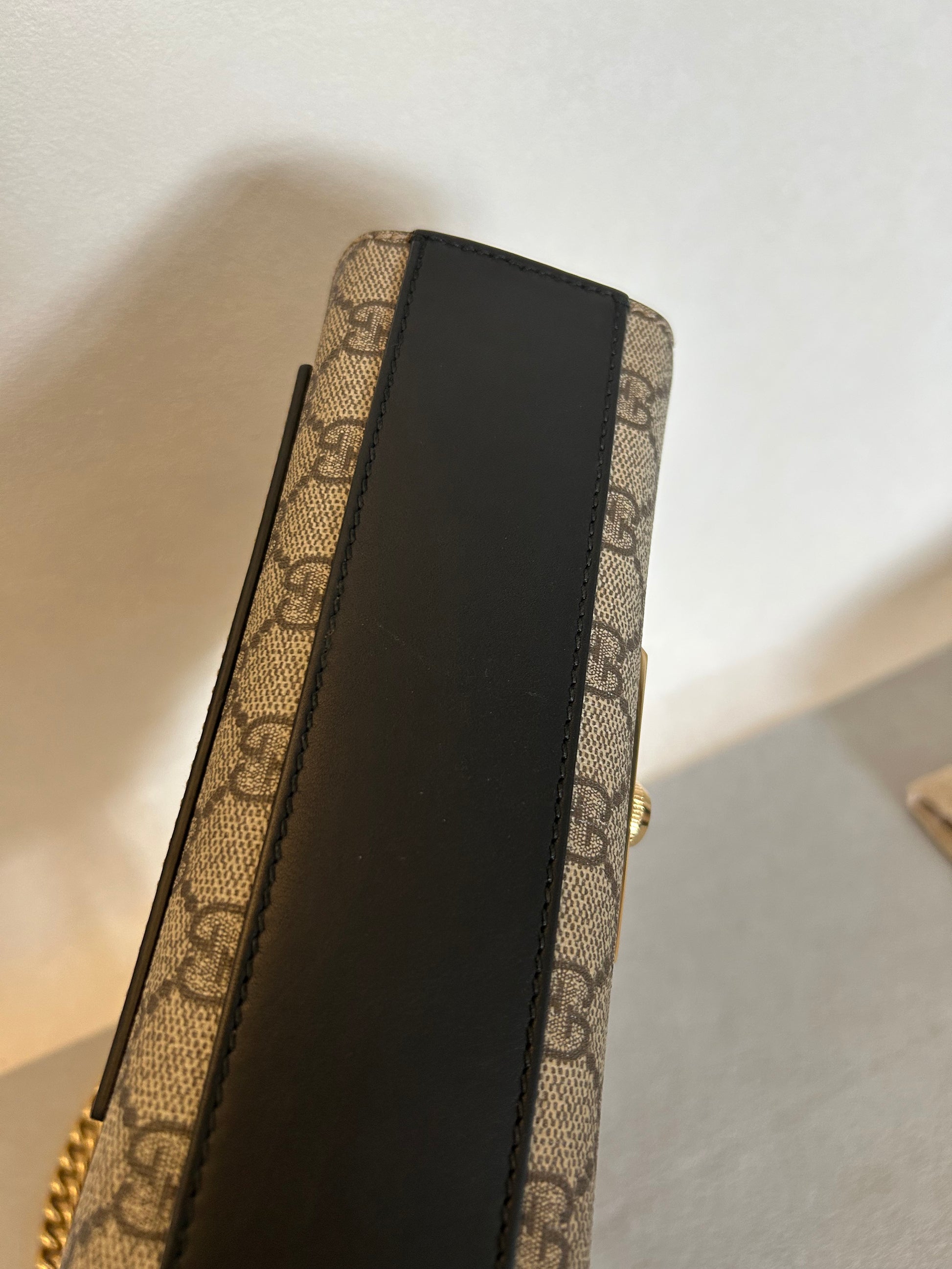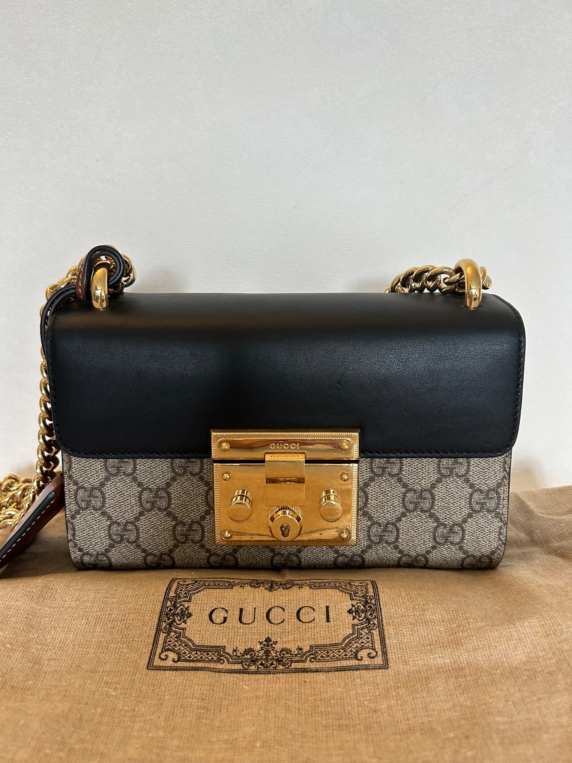 The Gucci Padlock GG Supreme Shoulder Bag represents luxury heritage craftsmanship. Distinguished by its monogrammed canvas construction and signature padlock detail, this refined accessory balances iconic design with practical functionality. The durable coated canvas resists wear while maintaining its distinctive pattern, complemented by premium leather trim and precise hardware finishes.