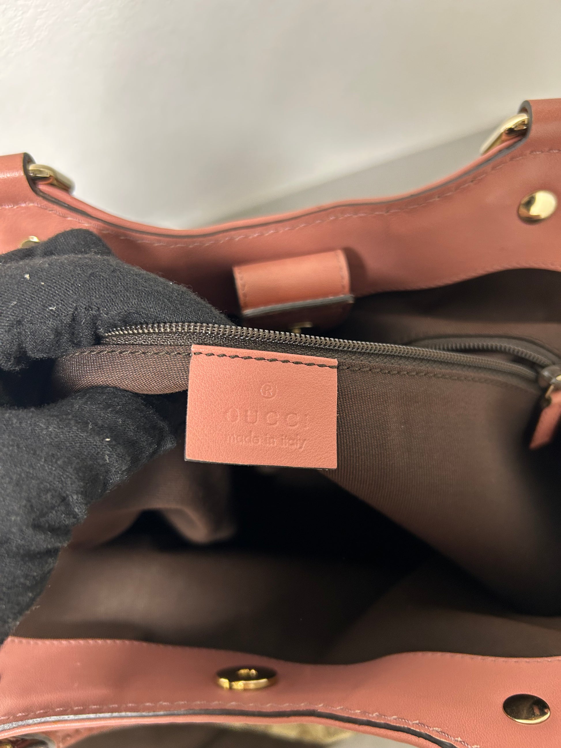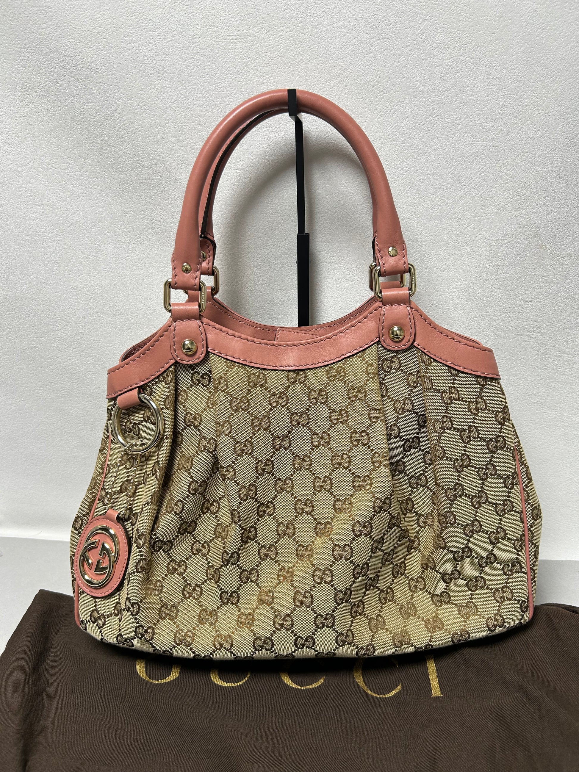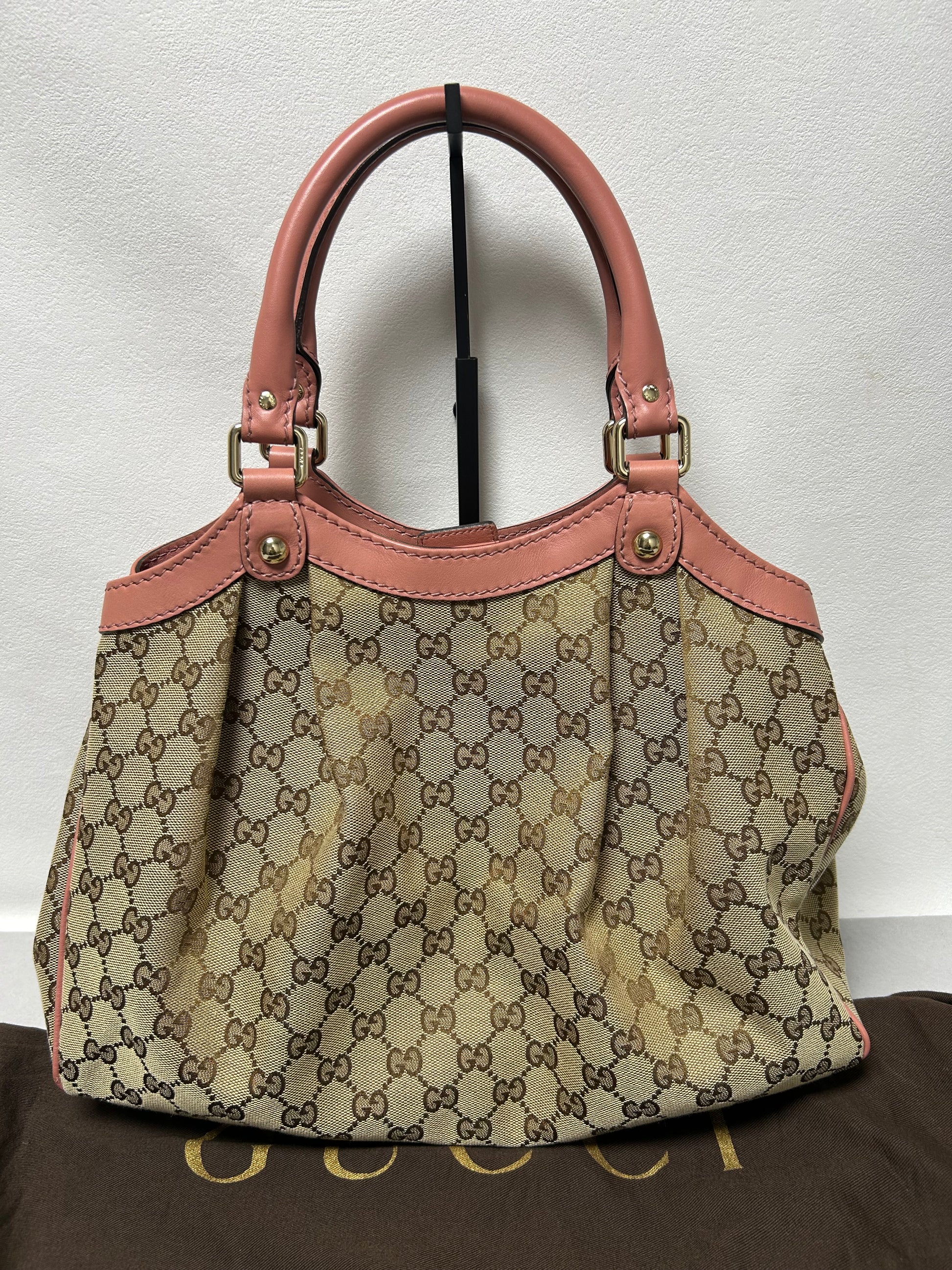 The Gucci Sukey tote bag is the perfect blend of style and functionality. Made with beige GG canvas and accented with pink leather trim, this bag exudes luxury and elegance. In very good condition, it's a timeless accessory that will elevate any outfit.