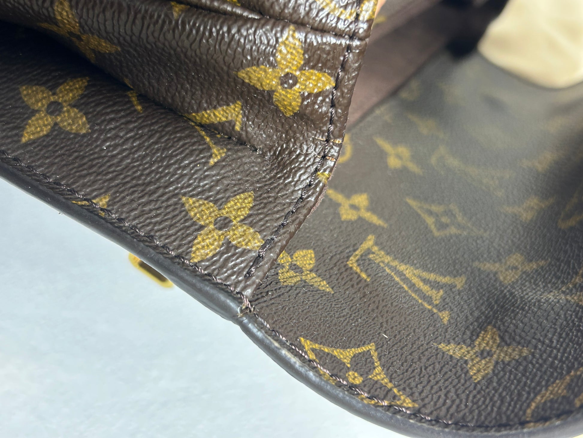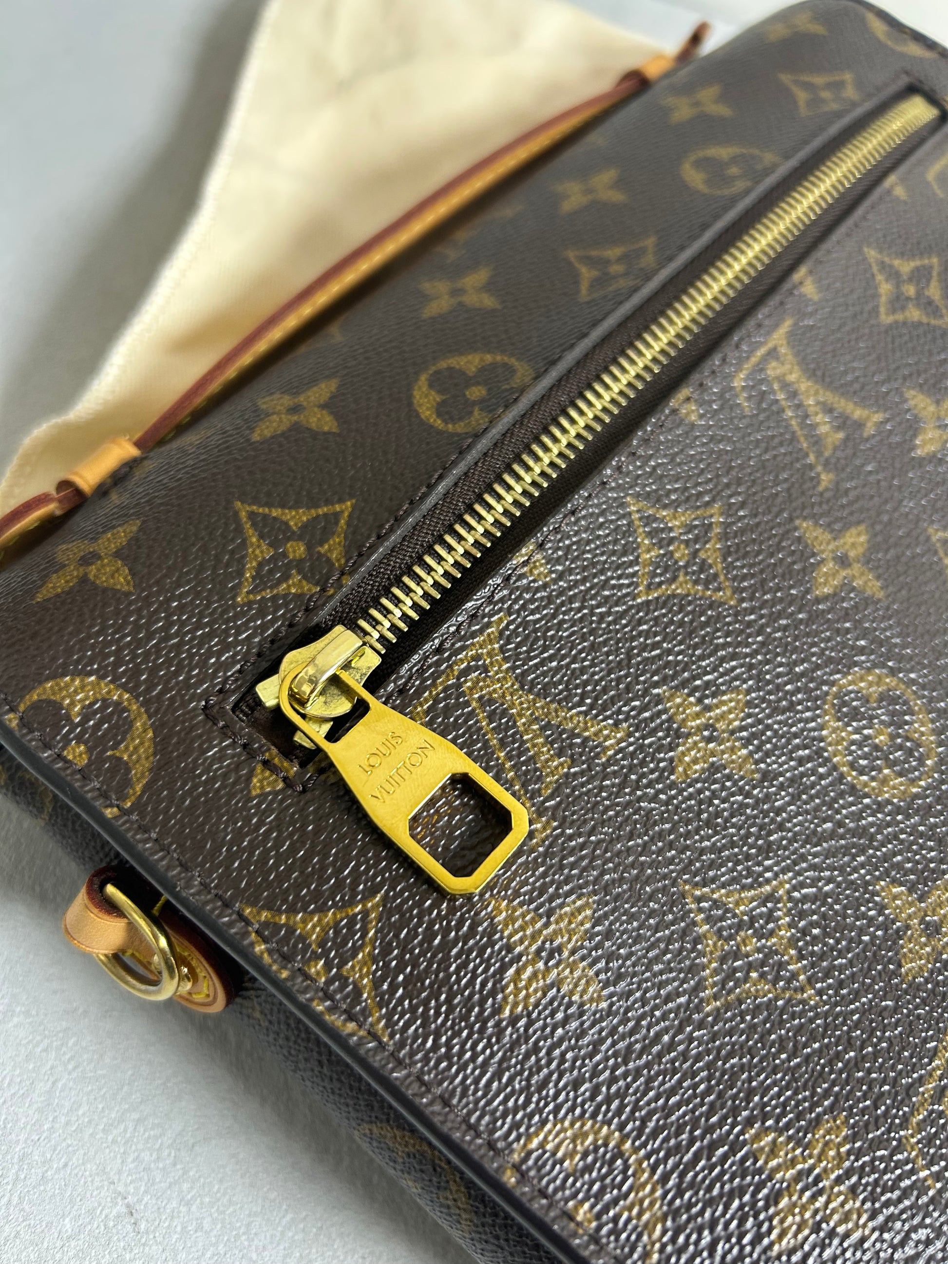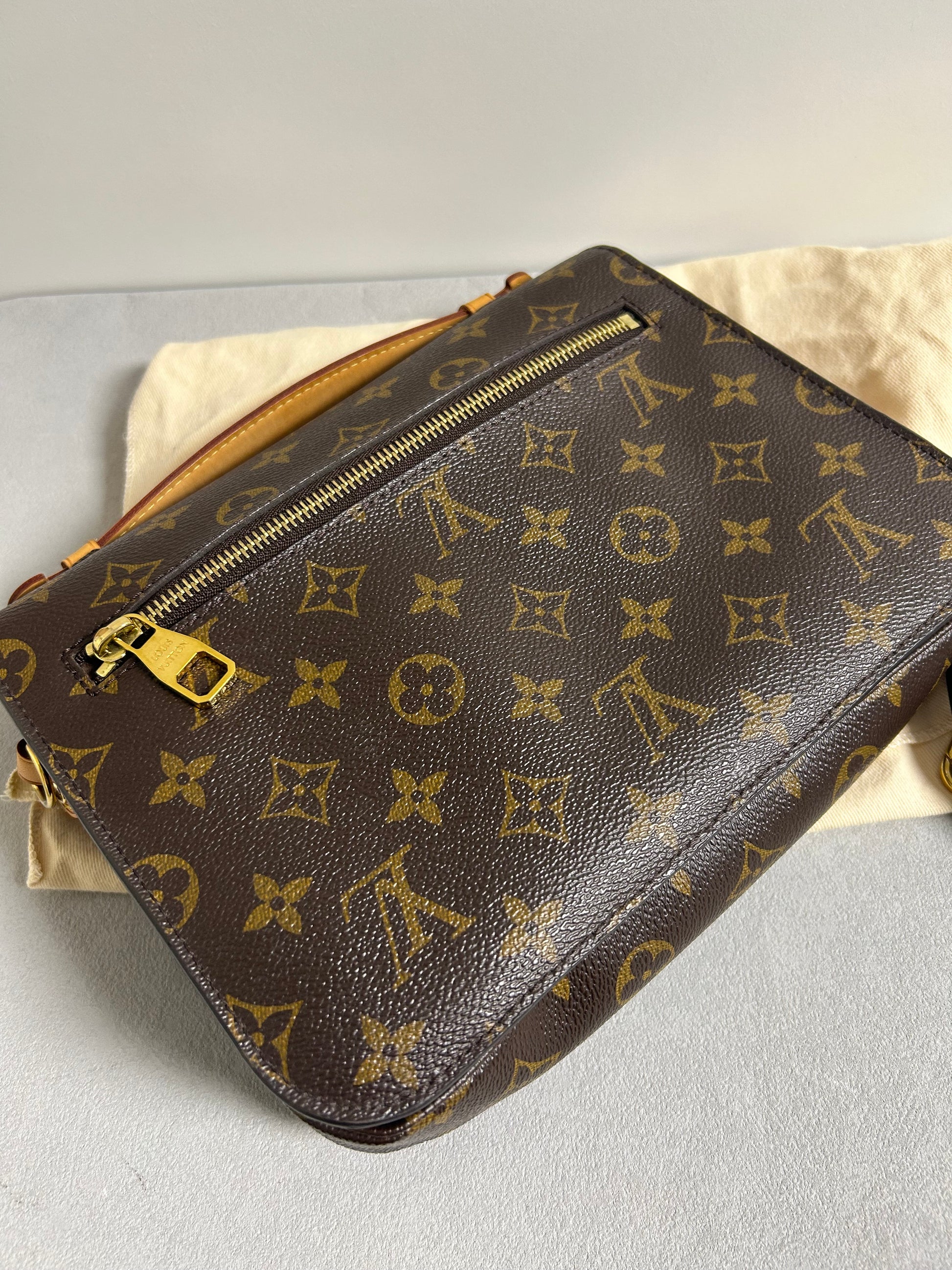 This preloved Louis Vuitton monogram pochette Metis boasts iconic style and versatility. Despite signs of wear, it remains a timeless accessory for any occasion. Comes with dust bag.
