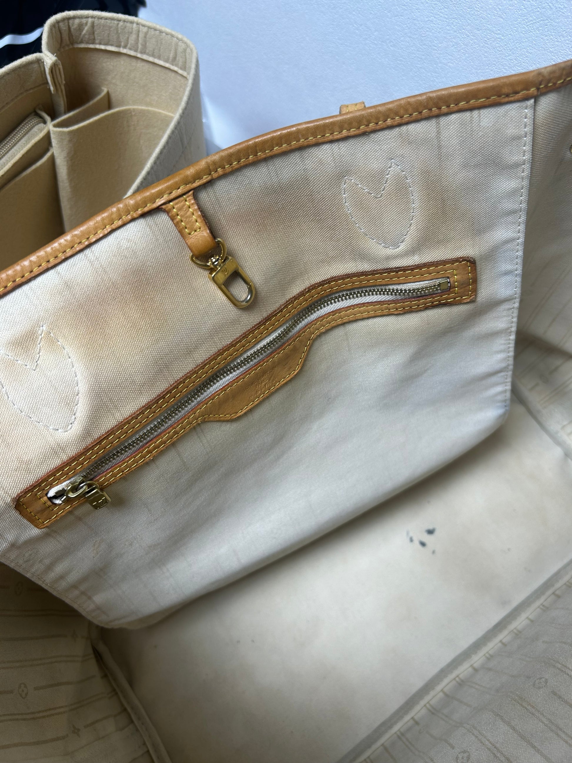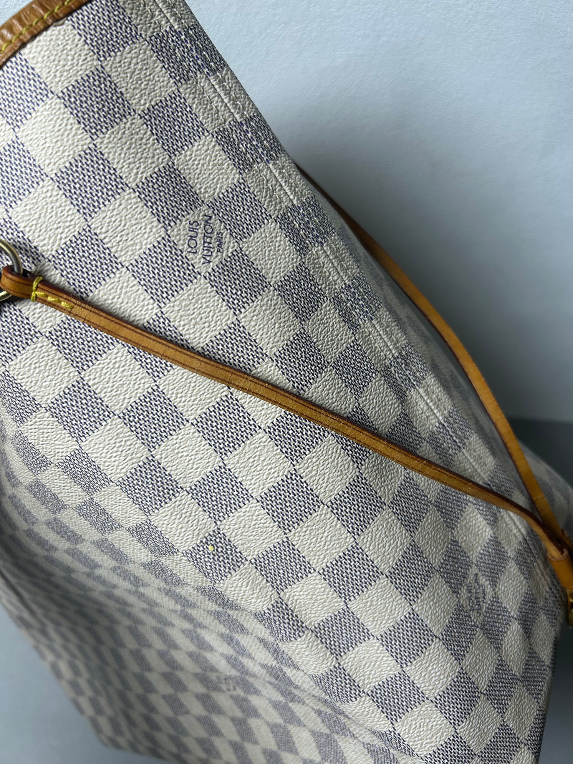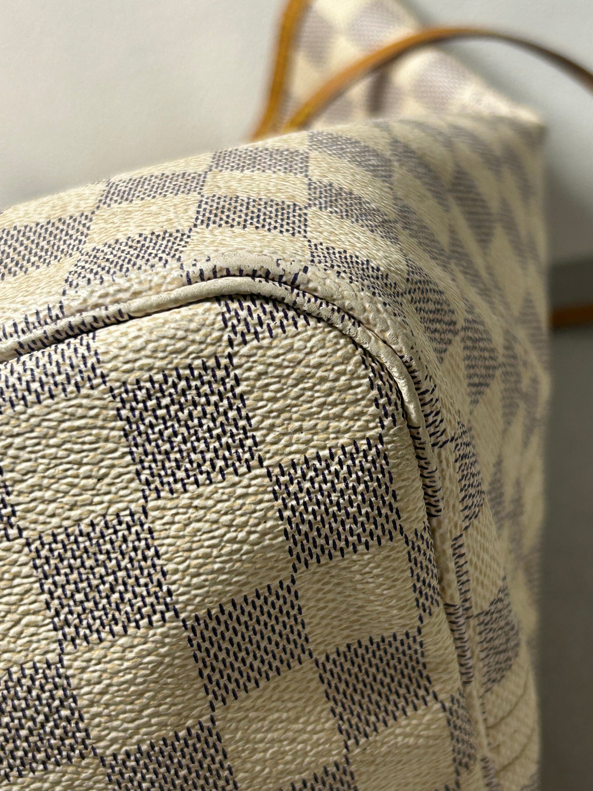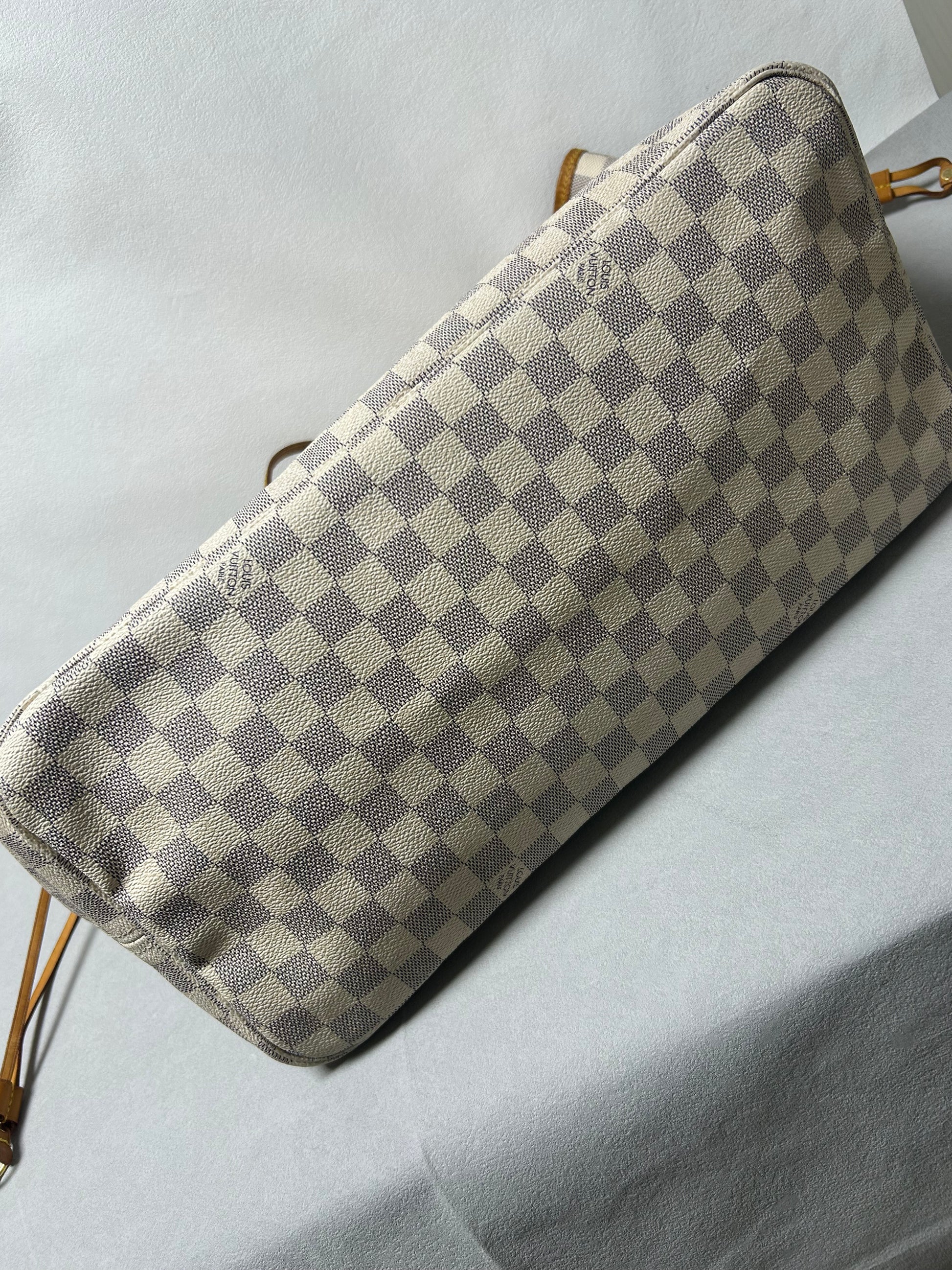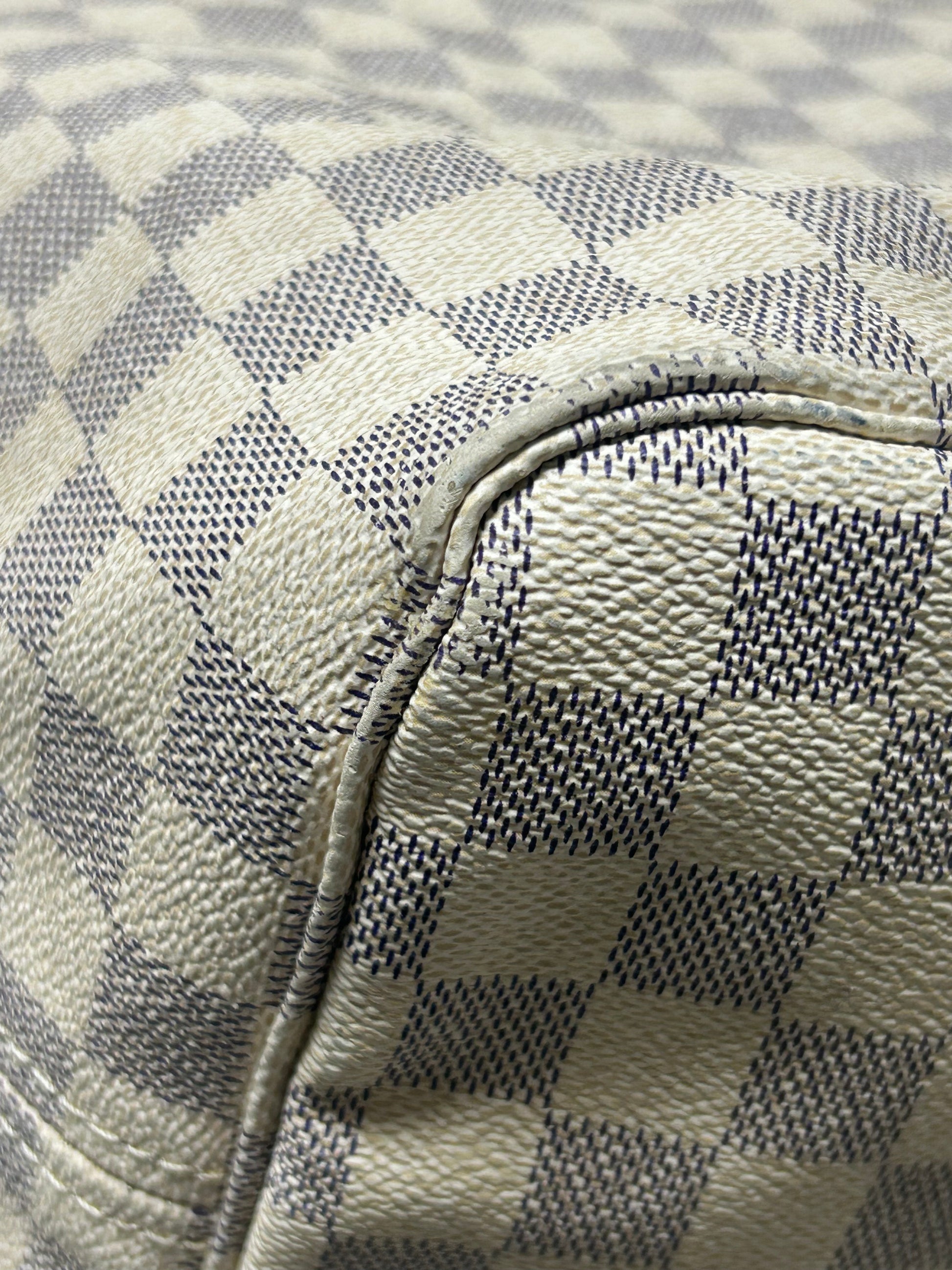 This Louis Vuitton neverfull GM in Damier Azur is a preloved bag with marks inside. It offers a timeless and iconic design, along with a spacious interior to carry all your essentials.