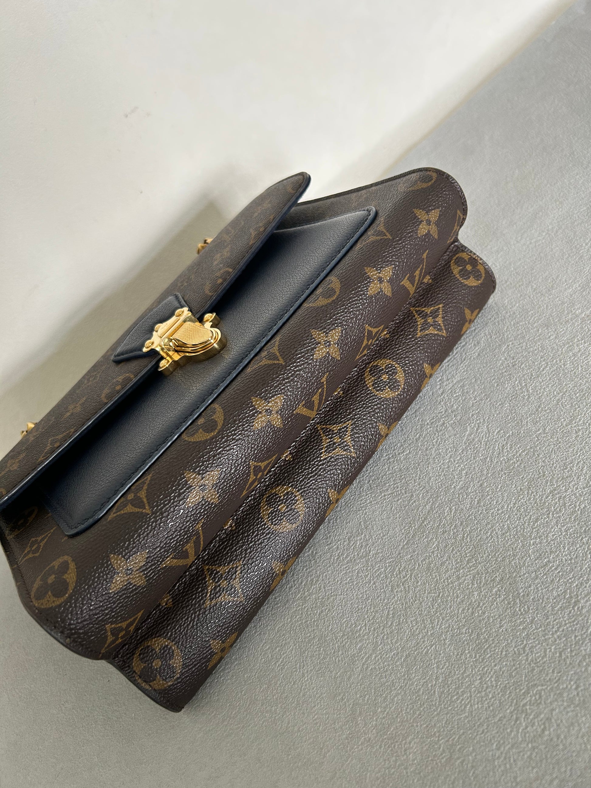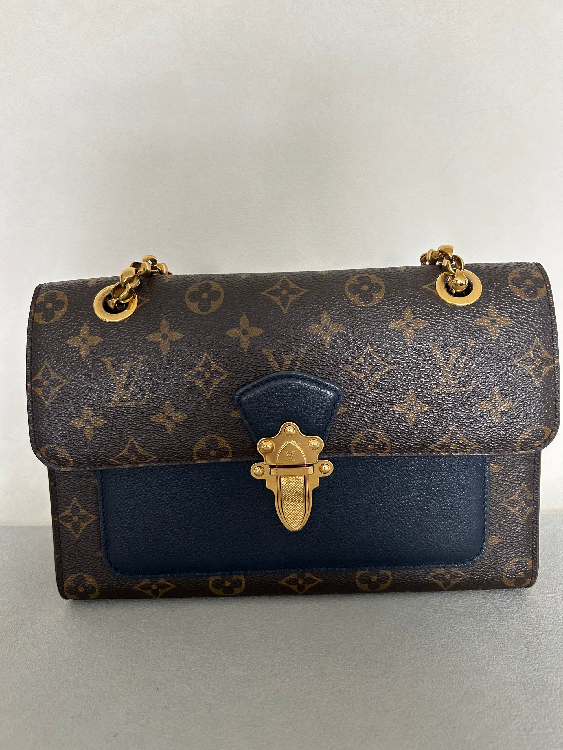 The Louis Vuitton Victoire shoulder bag combines iconic monogram canvas with elegant navy blue leather detailing.